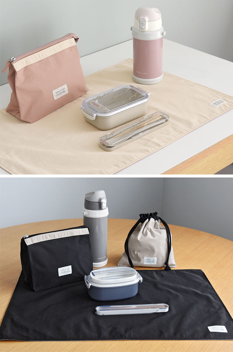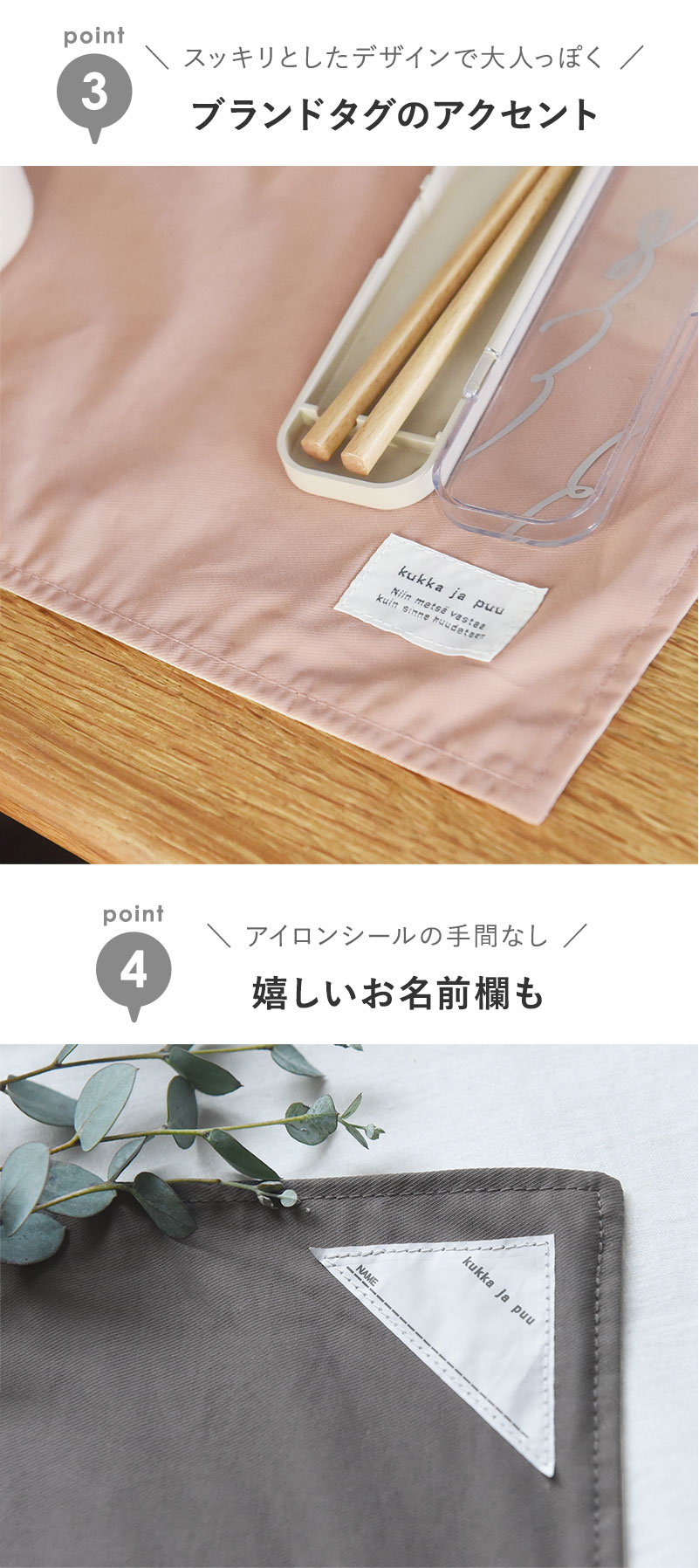 またお名前タグもついているので、アイロンなどで記名の準備をする手間もなし。「花と木のようにすくすく元気に育って欲しい」という思いを込めたkukka ja puuのタグが、シンプルなランチョンマットの程よいアクセントになっています。