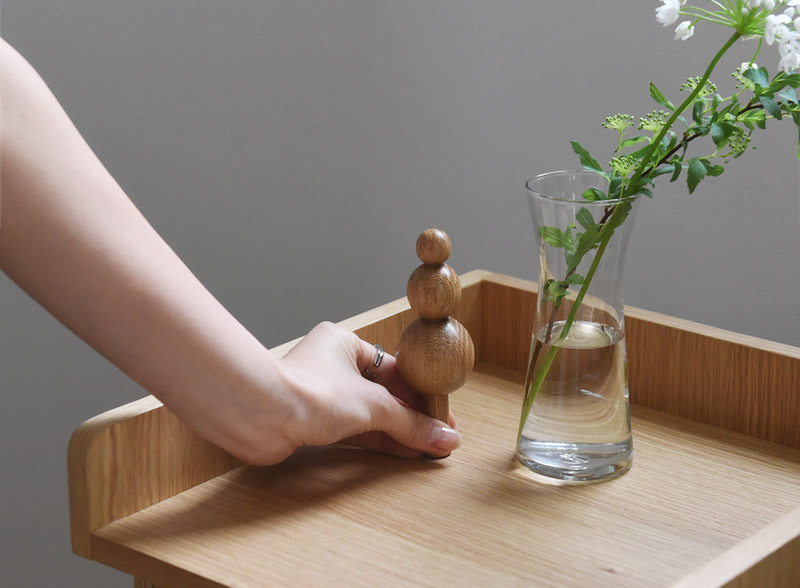 ツリーオブジェはすべて、1つの木材を削り出して制作されています。旋盤に乗せ、非常に繊細なタッチで木を削っていきます。それはまさに職人のなせる技。丁寧にやすりをかけてすべすべに磨き、木の呼吸を妨げない、ナチュラルなオスモオイルで仕上げています。