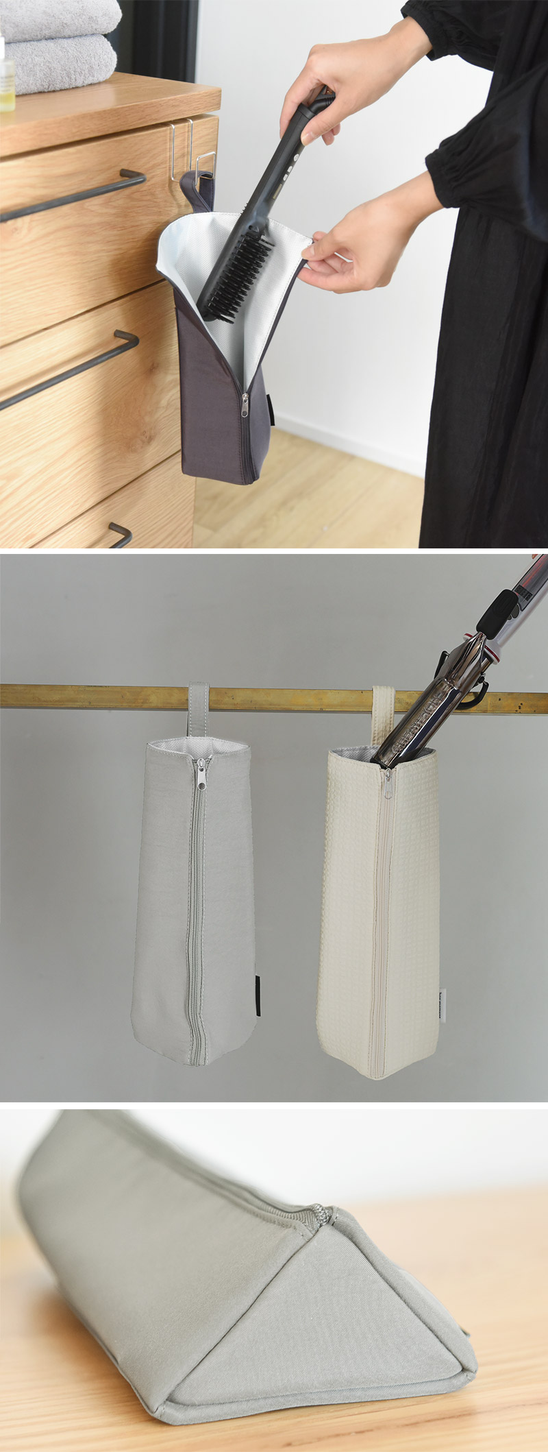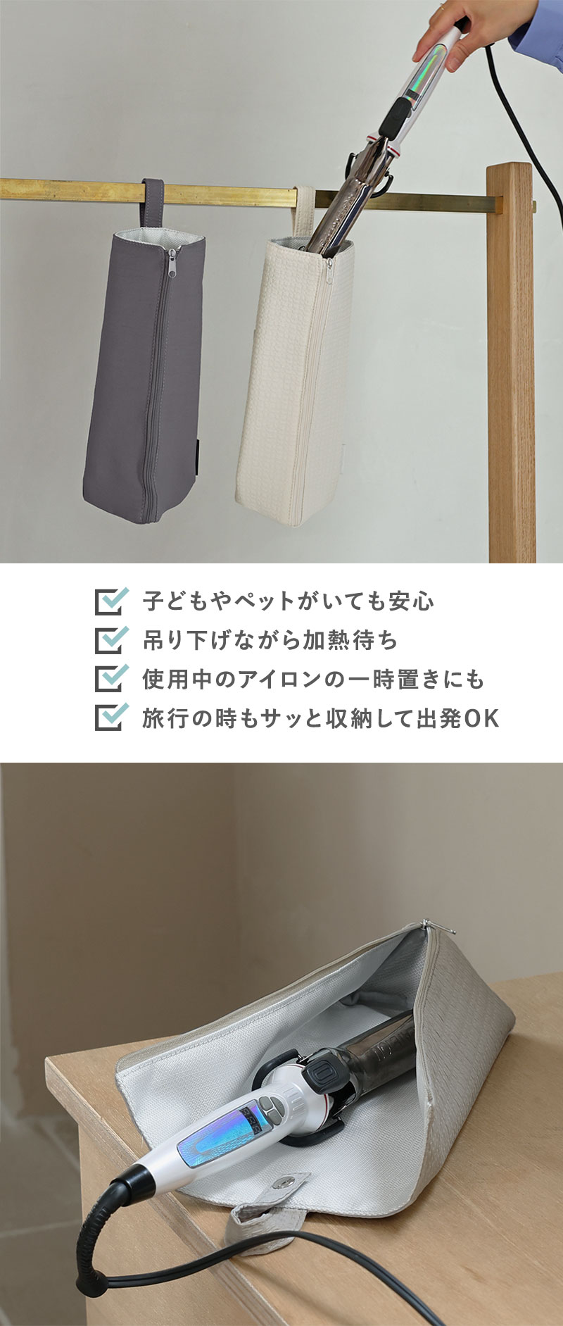 耐熱素材のヘアアイロンケース。洗面所に吊るしておけば、アイロンをスムーズに出し入れ&収納。洗面台でアイロンホルダーとしてや、旅行用のヘアアイロンポーチとしても使えます。