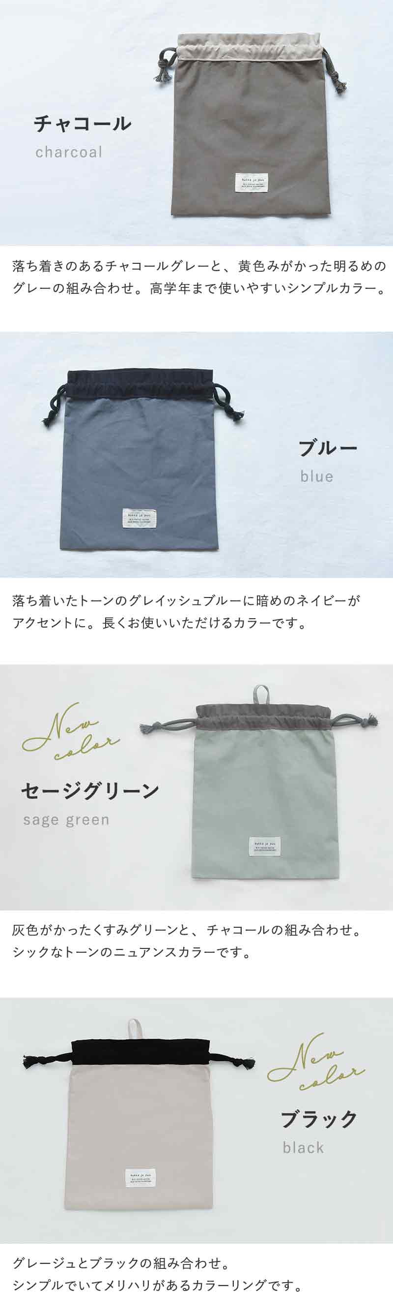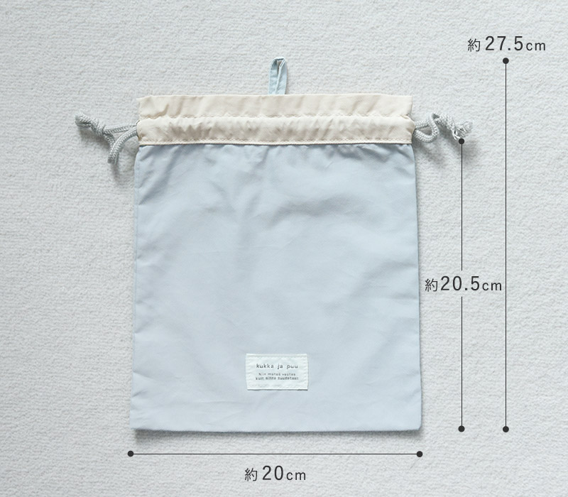 kukka ja puu(クッカヤプー)の落ち着いた北欧カラーの「巾着袋(小)」。ランチョンマットやコップを入れるのにちょうどいいサイズ感で、シンプルデザインだから、入園・入学から高学年まで幅広くお使いいただけます。