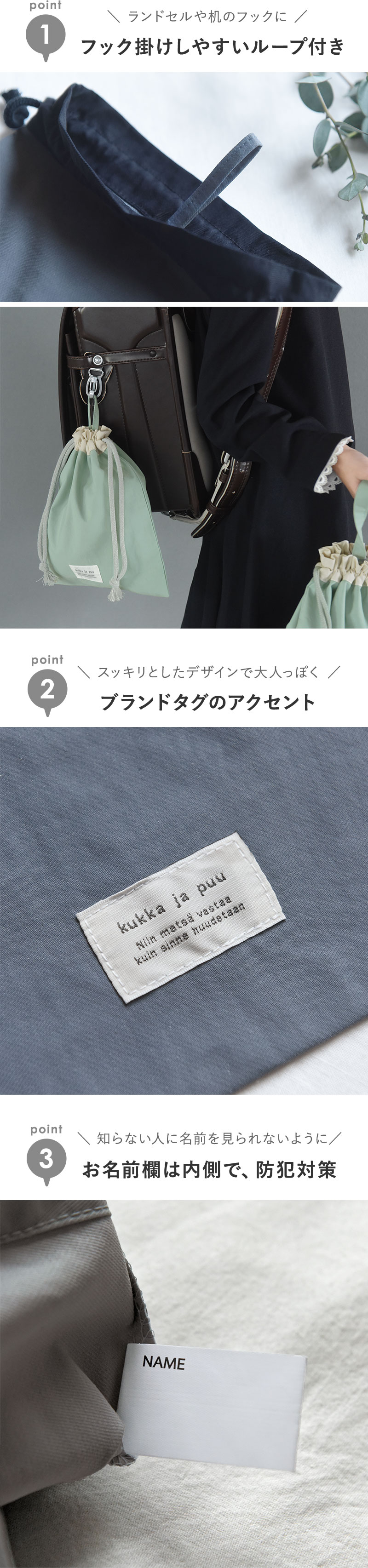 「花と木のようにすくすく元気に育って欲しい」という思いを込めたkukka ja puuのタグが、少し大人っぽさを添えています。
