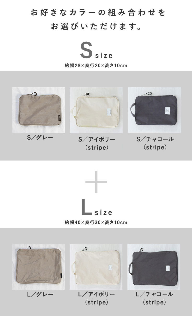 こちらは、1~2泊分の衣類が入るSサイズと1~3泊分の衣類も入る大きめのLサイズがセットに。家族分の下着や洋服を分けて収納できるので家族旅行に重宝します。