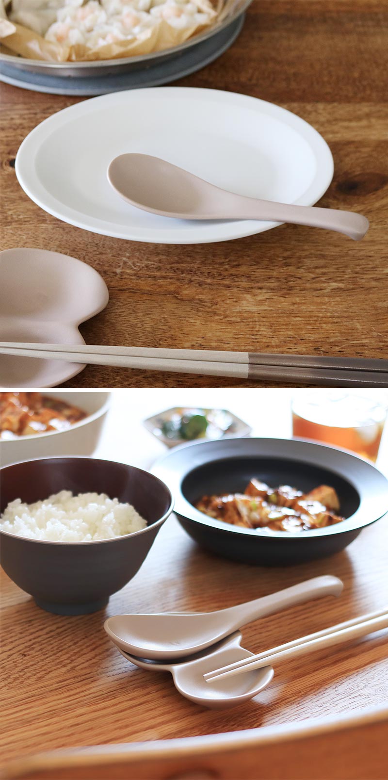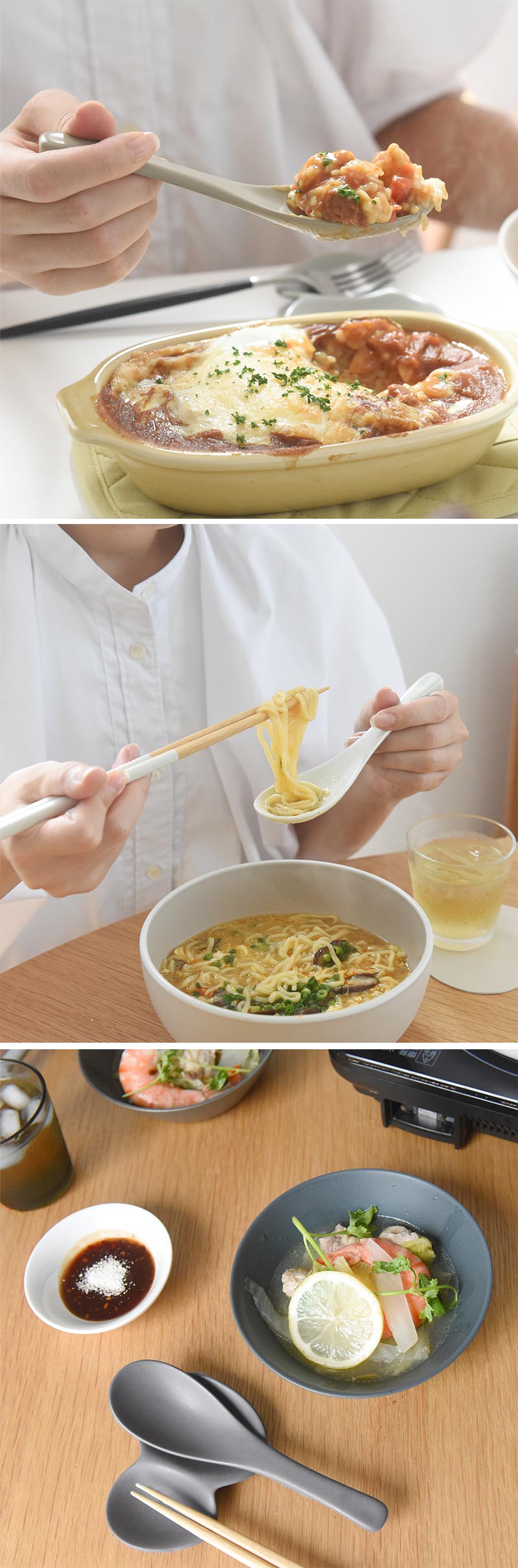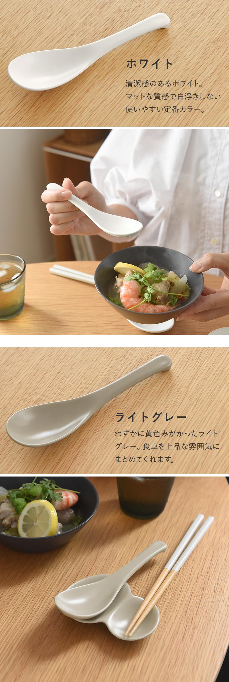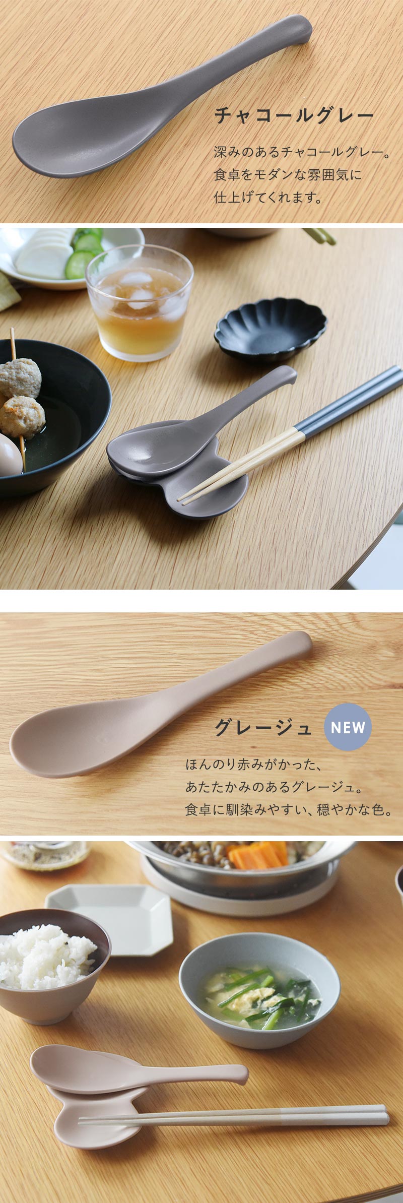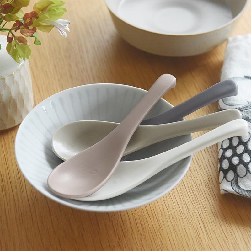 高評価いただいている「れんげスプーン」に、温かみのある柔らかなグレージュが仲間入りしました。白や黒などの器にも、彩り豊かな器にも合わせやすいニュアンスカラーで、一年中活躍してくれます。