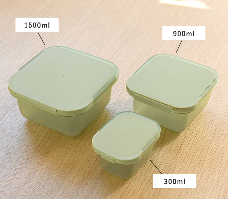 サイズは選べる3種類(300ml、900ml、1500ml)。こちらは、それぞれのサイズが揃った3点セット。常備菜や作り置きの保管、お弁当など、サイズによって使い分けができます。