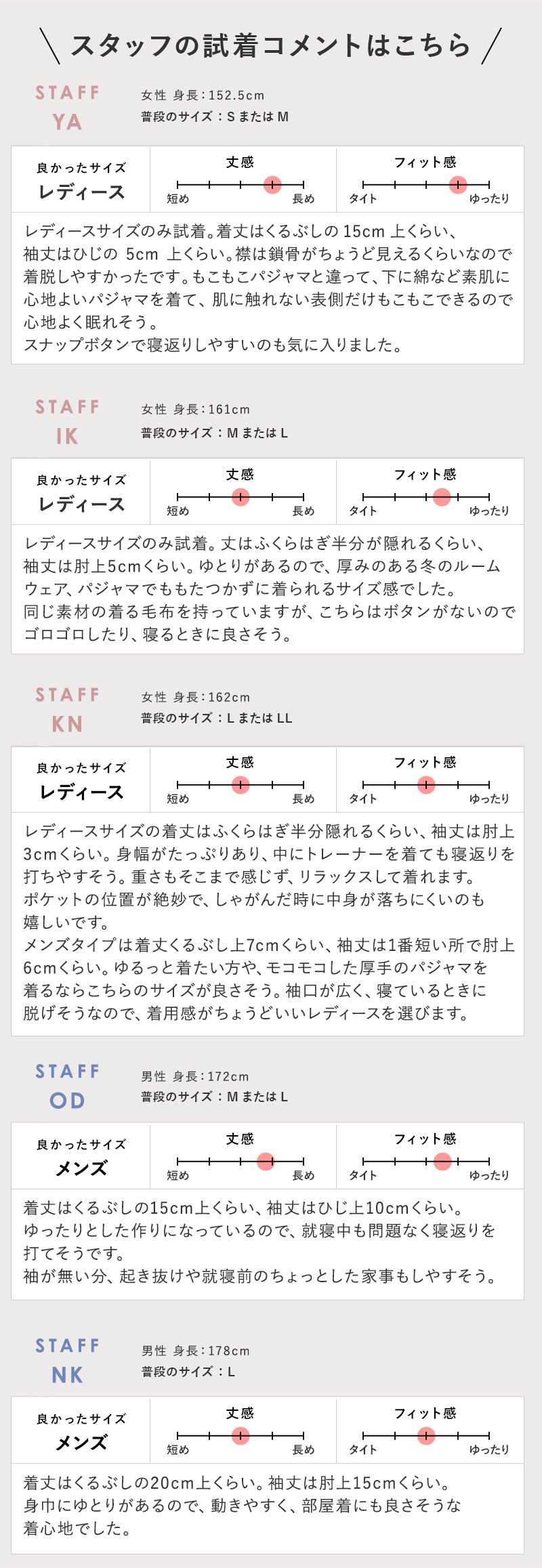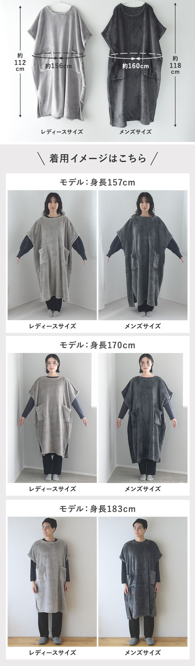 また、全体にゆったりとしたシルエットで、寝返りを打ちやすくしています。着丈はレディース約112cm、メンズ約119cmと太ももまでしっかり覆える長さです。