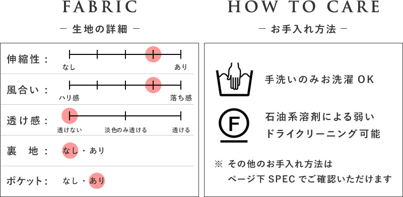※デリケートな素材を使用しておりますので、引 っかかりや摩擦には気を付けてください。着用の際は、アクセサリー、バッグ、時計などとの接触にはご注意ください。 - お手入れ方法