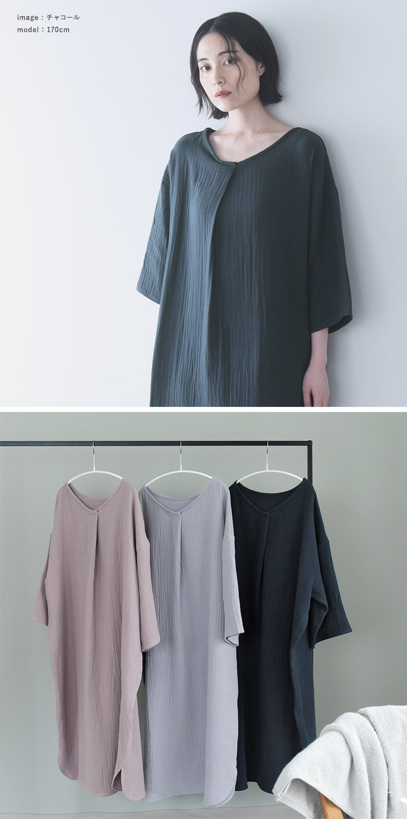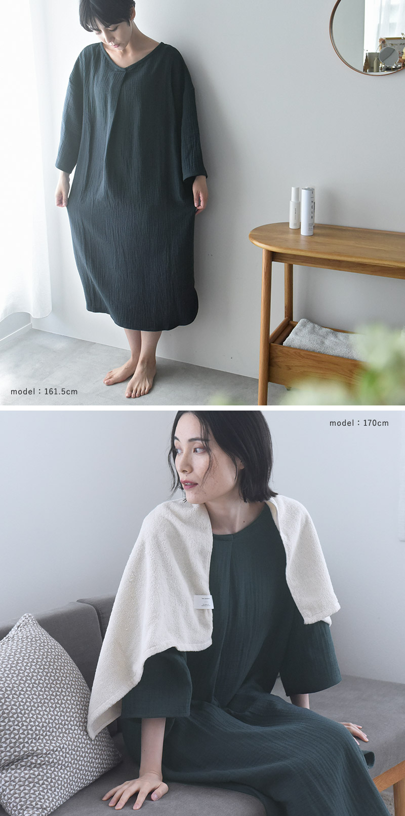 湯冷め防止のためにまずこれを着て、やることが落ち着いてからナイトウェアにゆっくり着替え。ばたばたと忙しい夜に少しだけゆとりをもたせてくれる湯上りワンピです。