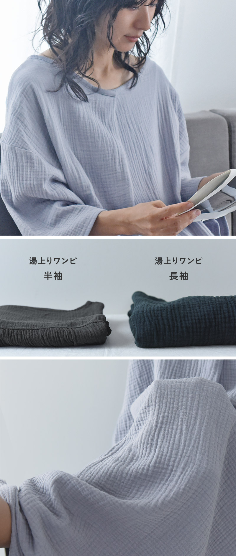 お風呂上がりにサッと着られて、汗が引くまでの間、ゆっくりと過ごせる「湯上りワンピース」。コットン100%のガーゼ素材は涼しい着心地。吸水性も◎です。