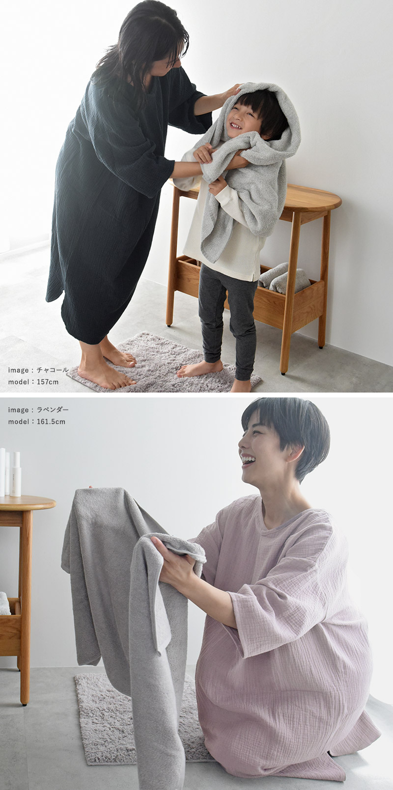 お風呂上りから、パジャマを着るまでの時間をつなぐ「湯上りワンピース」。ガーゼタオル素材なので、濡れた素肌に着ても、やさしく身体を包みながら水分を吸収。バスローブのような感覚でお使いいただけます。