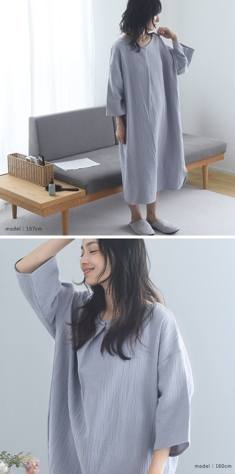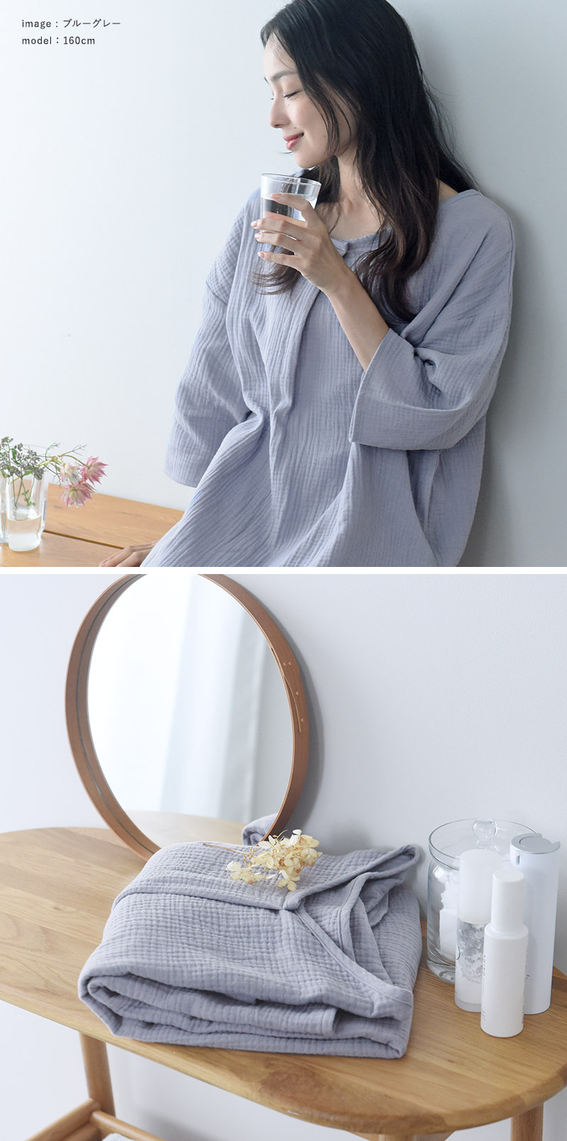 全体にコットン100%の3重ガーゼ素材を使った、程良く厚みがあるガーゼワンピース。サラサラふんわりとした肌触りで、お風呂上りの素肌に心地よく着られます。吸水性・通気性が抜群で、タオル素材より乾きやすいのも魅力。