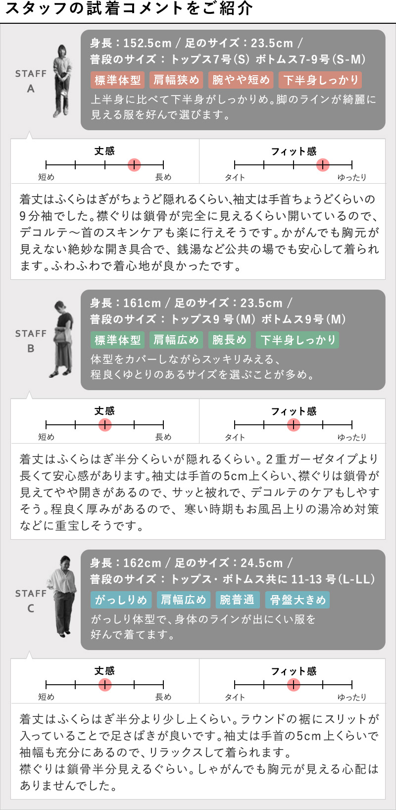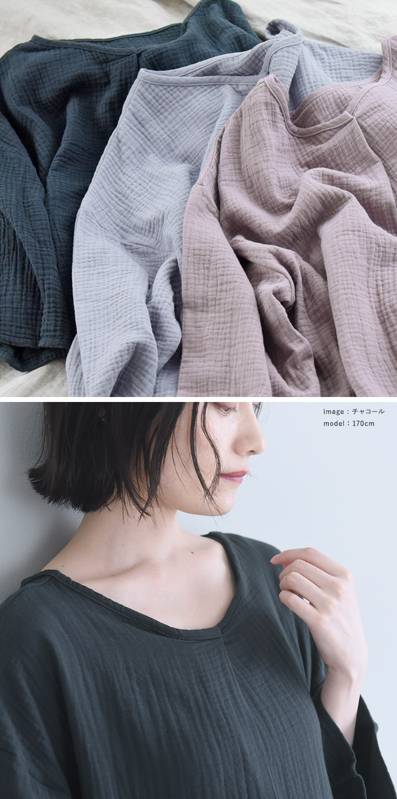 また、ガーゼ素材は使い込むほどに育つ素材。最初はややハリ感がありますが、洗濯を繰り返していくうちに柔らかくなっていきます。着るたびに増していくふんわり感をお楽しみください。