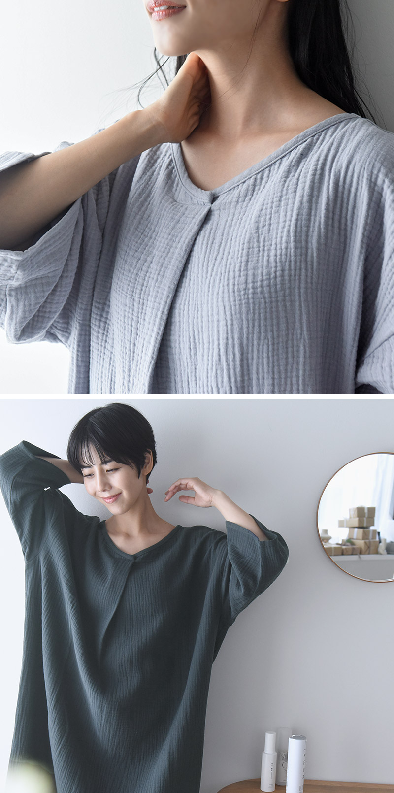 寒い季節に着やすい7分袖バージョンで、素材はふっくらとやや厚みのある3重ガーゼを採用。