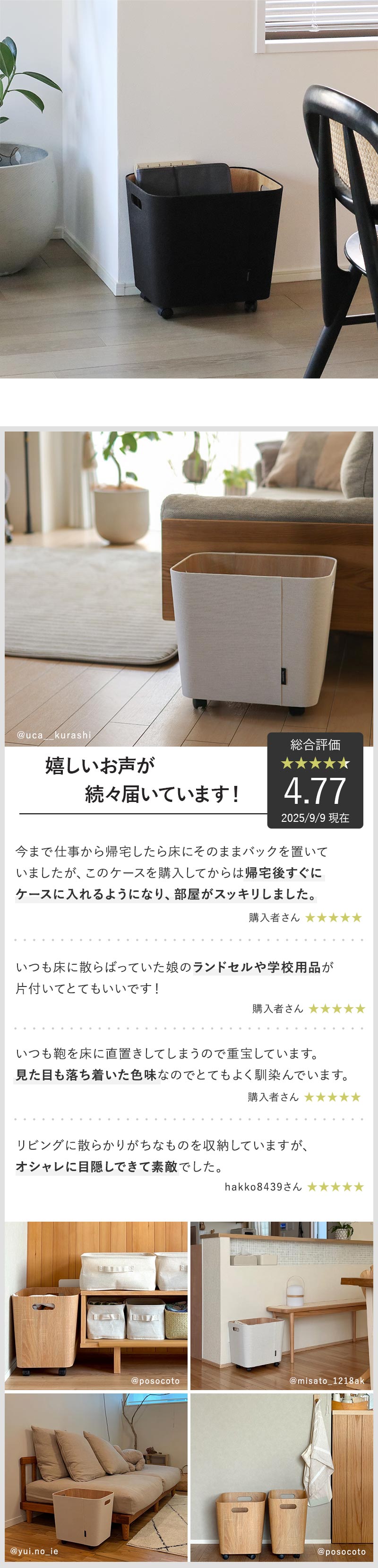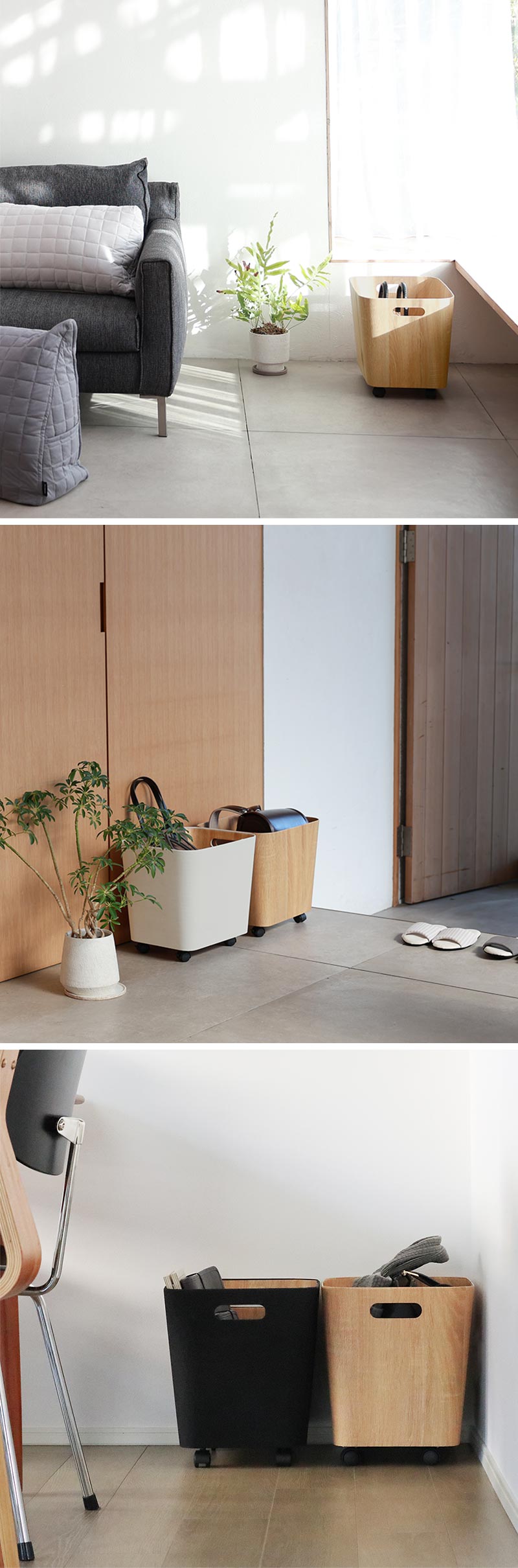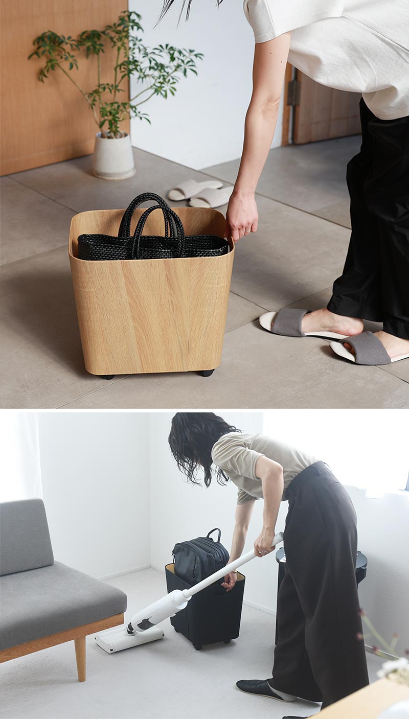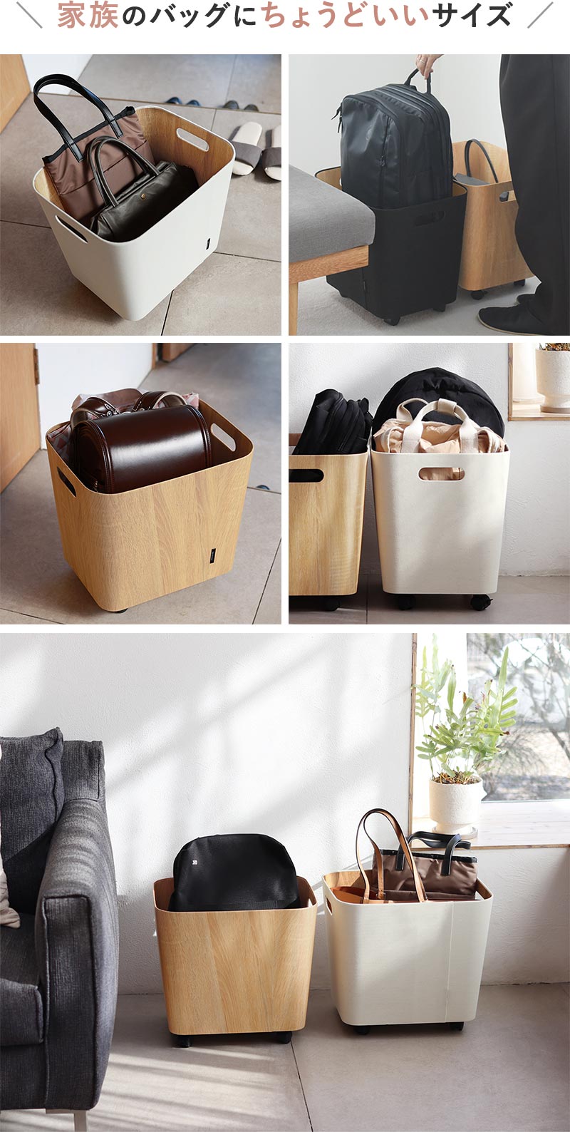 - 帰ってきたら荷物はココへ。家族みんなのバッグの一時置き場、キャスター付き収納ボックスです。ソファや床などに何気なく置きがちなカバンの定位置を決めてすっきり快適に。