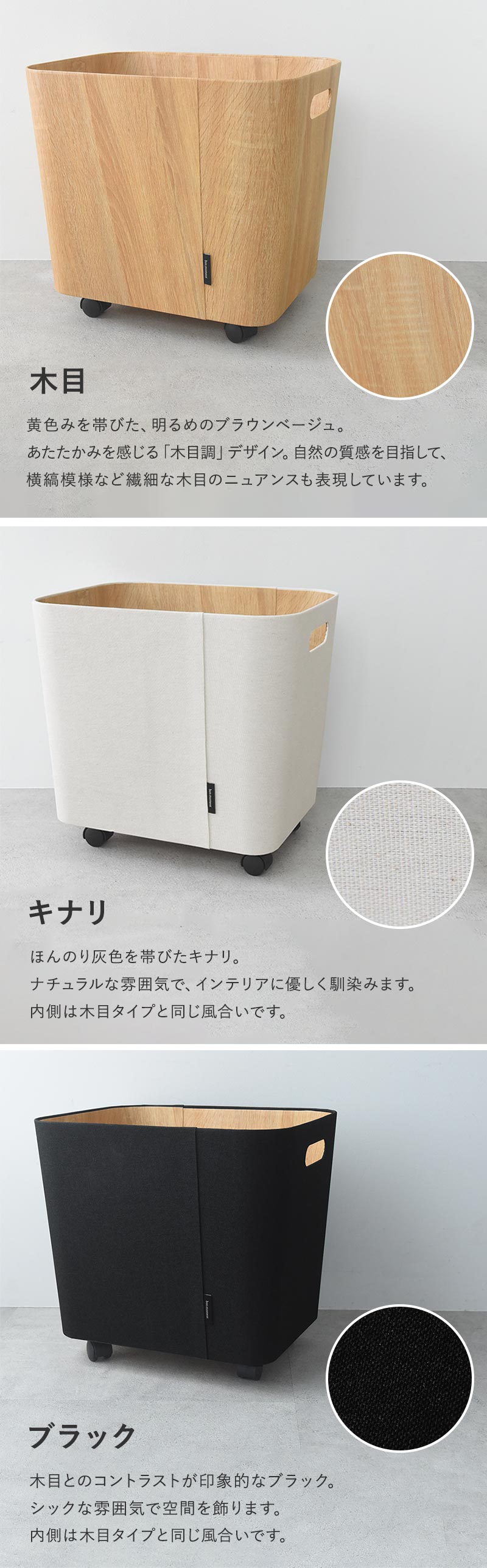 リアルな木目模様を再現した「木目調」と、キナリカラーの「ファブリック調」のホワイトとブラックの3種類をご用意しました。どれも床や壁の色、インテリアにも馴染むシンプルデザインです。