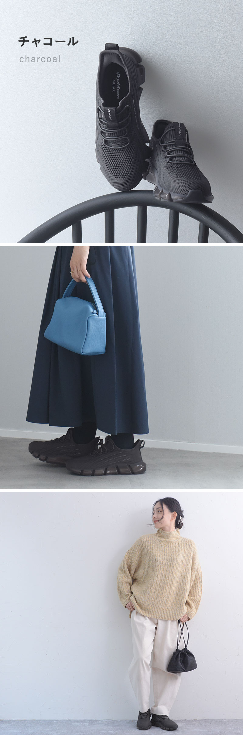落ち着いたトーンのチャコール。モノトーンコーデに合わせても重たくなりすぎず、抜け感をプラスしてくれます。