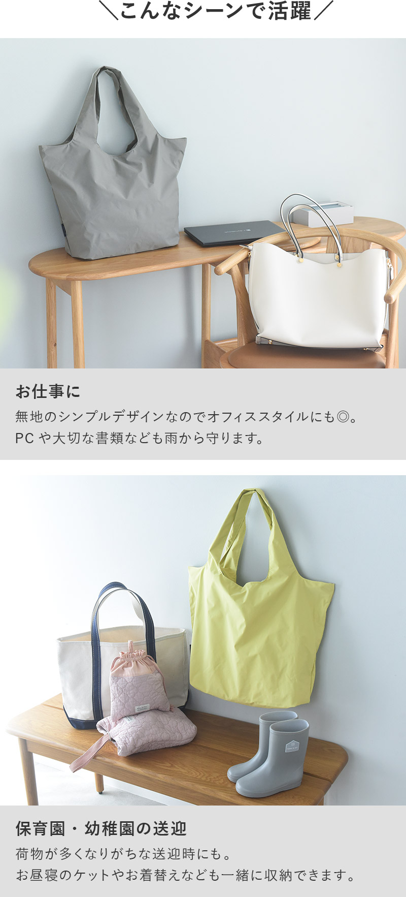 通勤バッグがまるごとすっぽり収まるサイズ感で、雨や汚れを防ぐ撥水加工付き。コレに荷物を入れておけば、お気に入りのバッグはもちろん、大切な書類やノートPCなども濡らさずしっかりと守ってくれます。