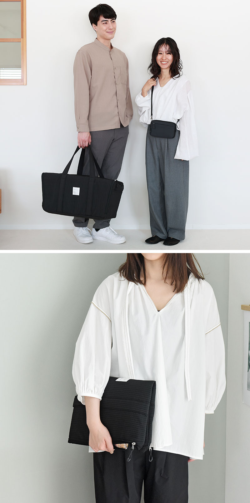 表面感のあるストライプ生地に白いタグをつけたシンプルさ。家族で持てるユニセックスなデザインです。