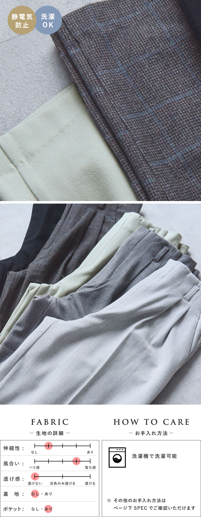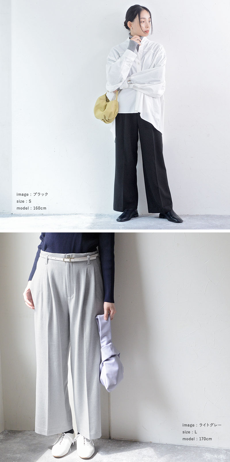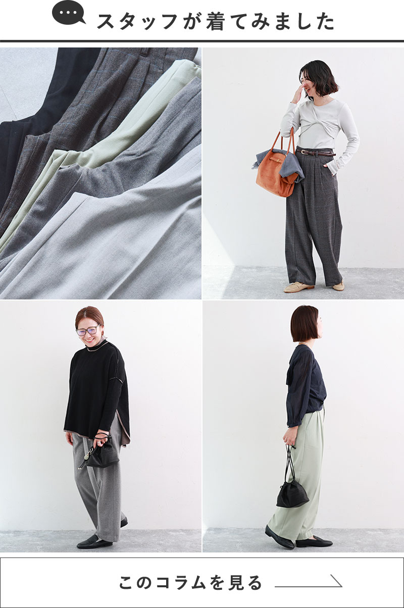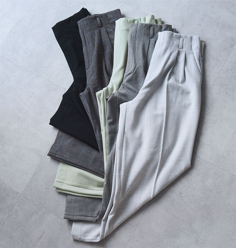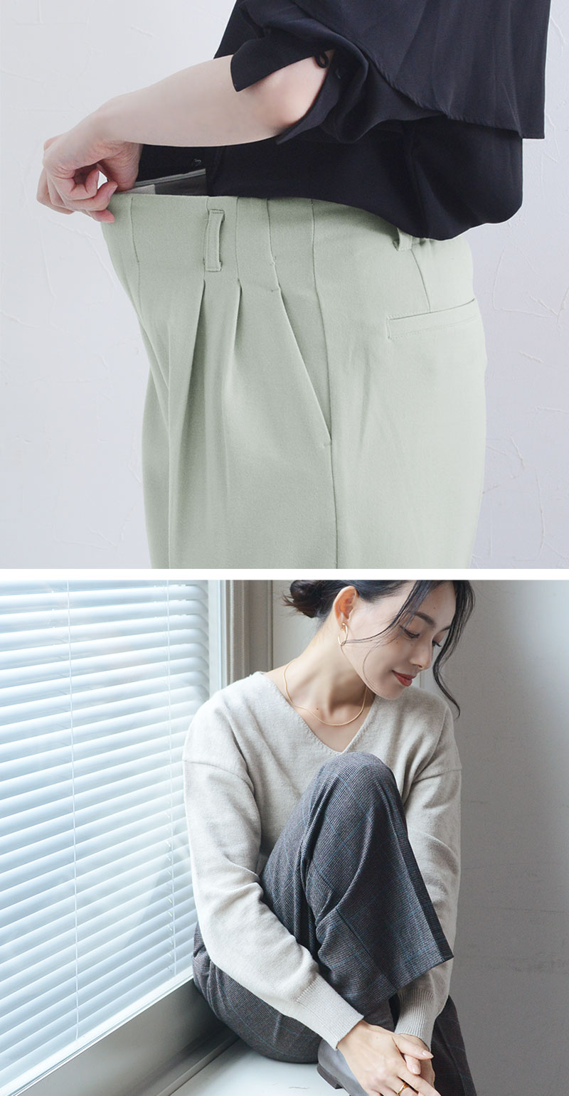 フロントに入った2つのタックと、ワイドシルエットで腰回りも上手にカバー。バリエーション豊かな5カラーで、お仕事コーデからきれいめカジュアルまで、様々なコーデをお楽しみいただけます。