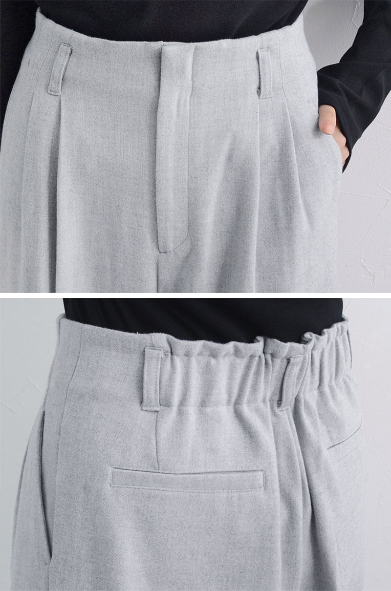 両面とも微起毛した素材を使ったタックパンツは、寒い日に足を通した時もヒヤっとせず、素肌にもやわらかな穿き心地。