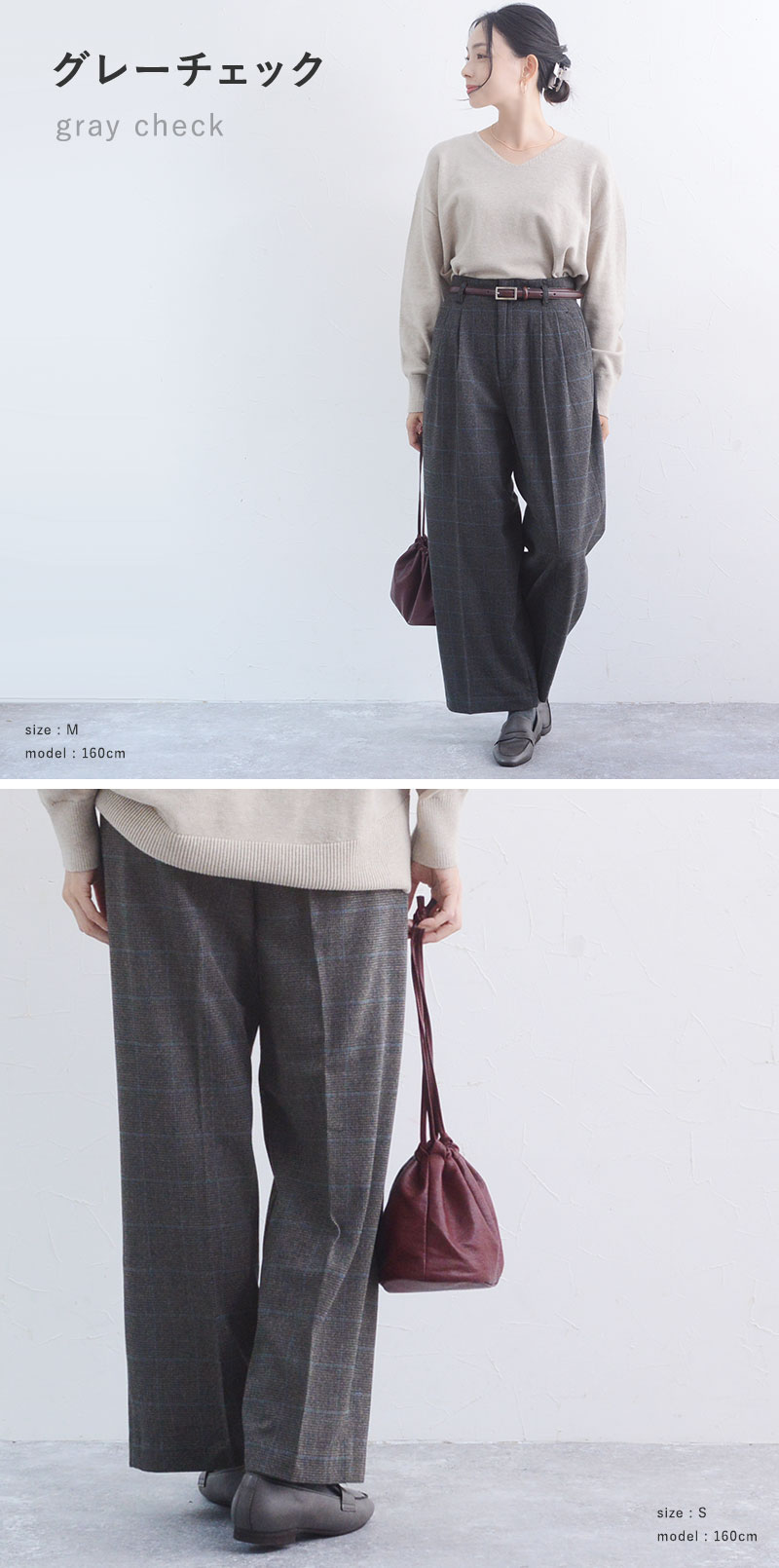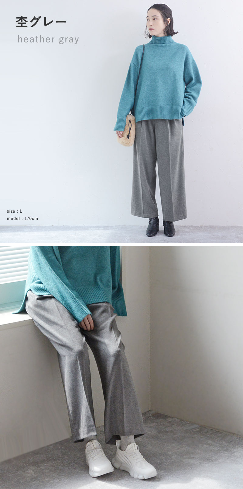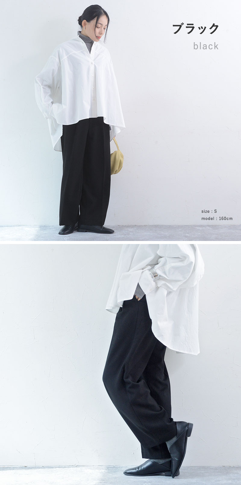 - 表地も裏地も微起毛のパンツ。素肌にも暖かく、秋冬コーデにぴったりです。タックが2つ入っているので着やせ効果も◎。ワイドシルエットで動きやすさも抜群です。