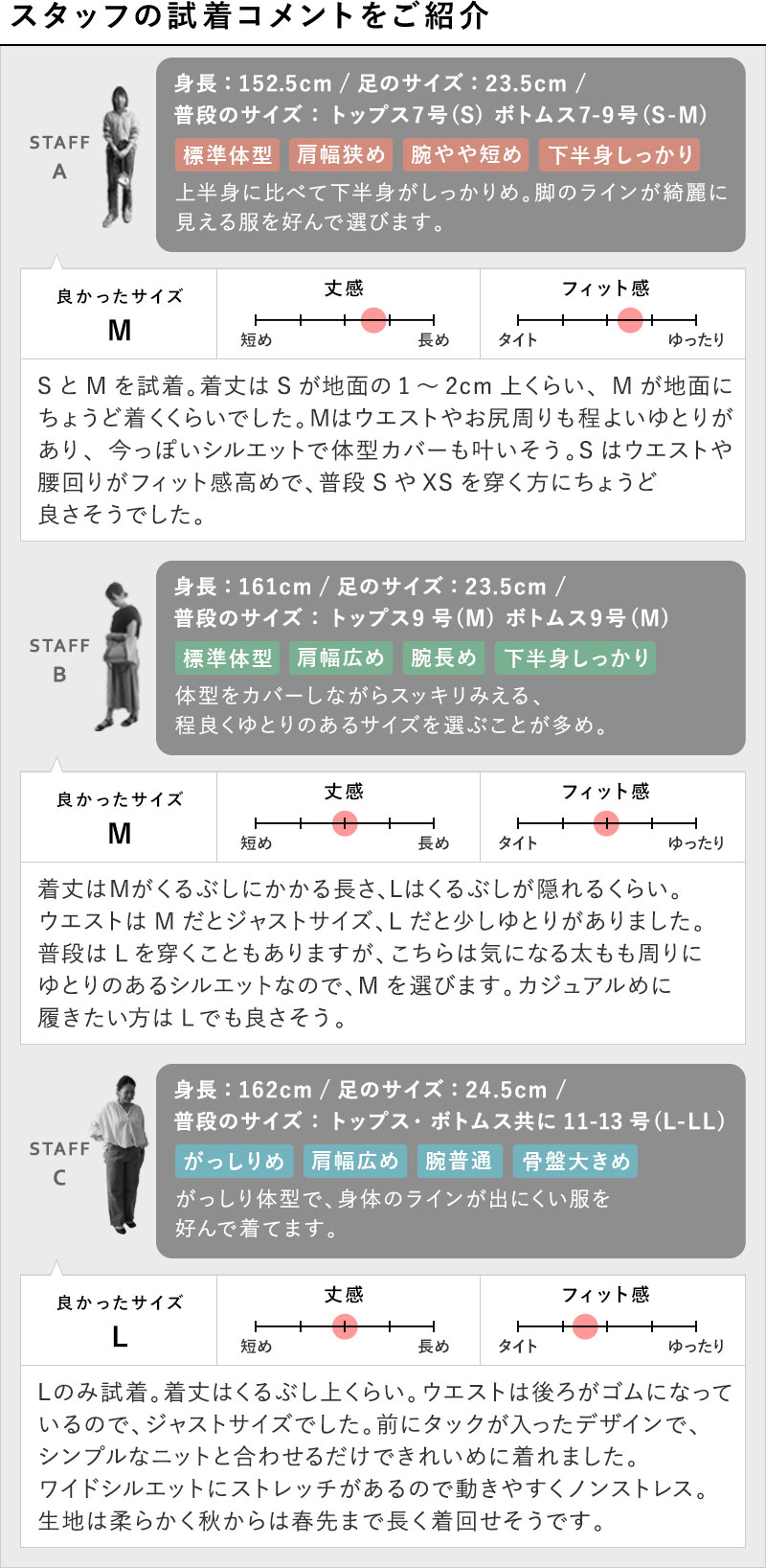 サイズはSからLサイズまでの3段階。お好みの丈感やフィット感でお選びいただけます。スタッフの試着コメントもぜひご参考ください。
