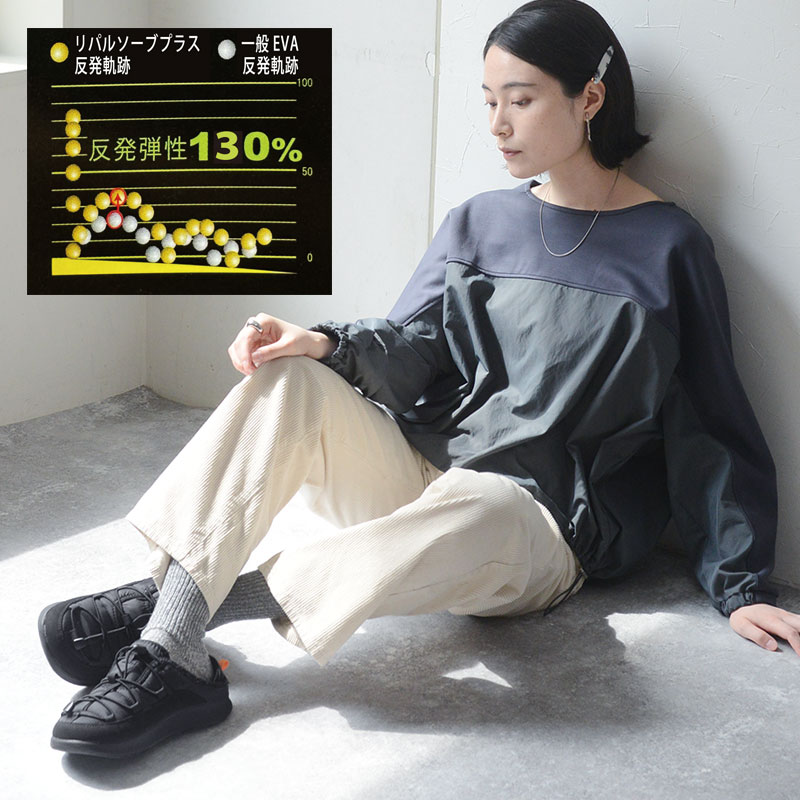 インソールには、独自開発された「リパルソーブプラス」を採用。もちもちと柔らかな感触で足を優しく受け止めます。