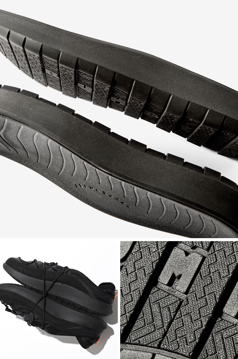 ソールを重ねてサイズ調整用のドローコードでまとめれば、簡単にパッカブル仕様に。ソール同士が重なるので汚れを気にせずに持ち歩けます。