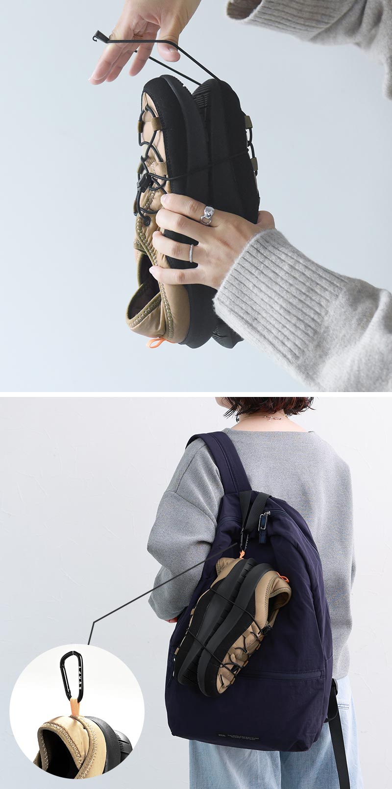 かかとのストラップや付属のカラビナを使うことで、リュックやカバンに取り付けも簡単。Mサイズだと片足約160gと軽量なのでアウトドアなど持ち歩きも最適です。