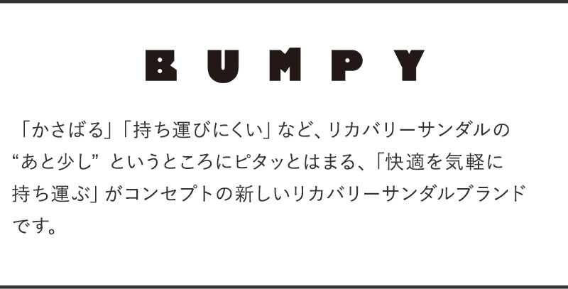 今っぽさのあるぽってりとした見た目に、足の負担を軽減するリカバリー機能を備えた一足。BUMPYが独自に開発をしたインソールで、安定感のある履き心地を叶えています。