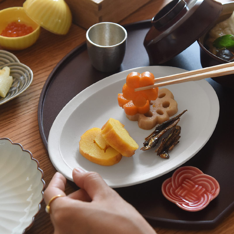 直径約21cmのオーバル皿は、取り皿や副菜の盛り付け、デザートプレートにもちょうど良いサイズ感です。