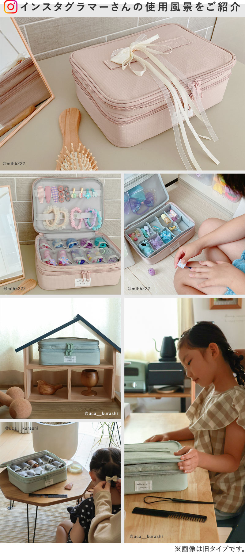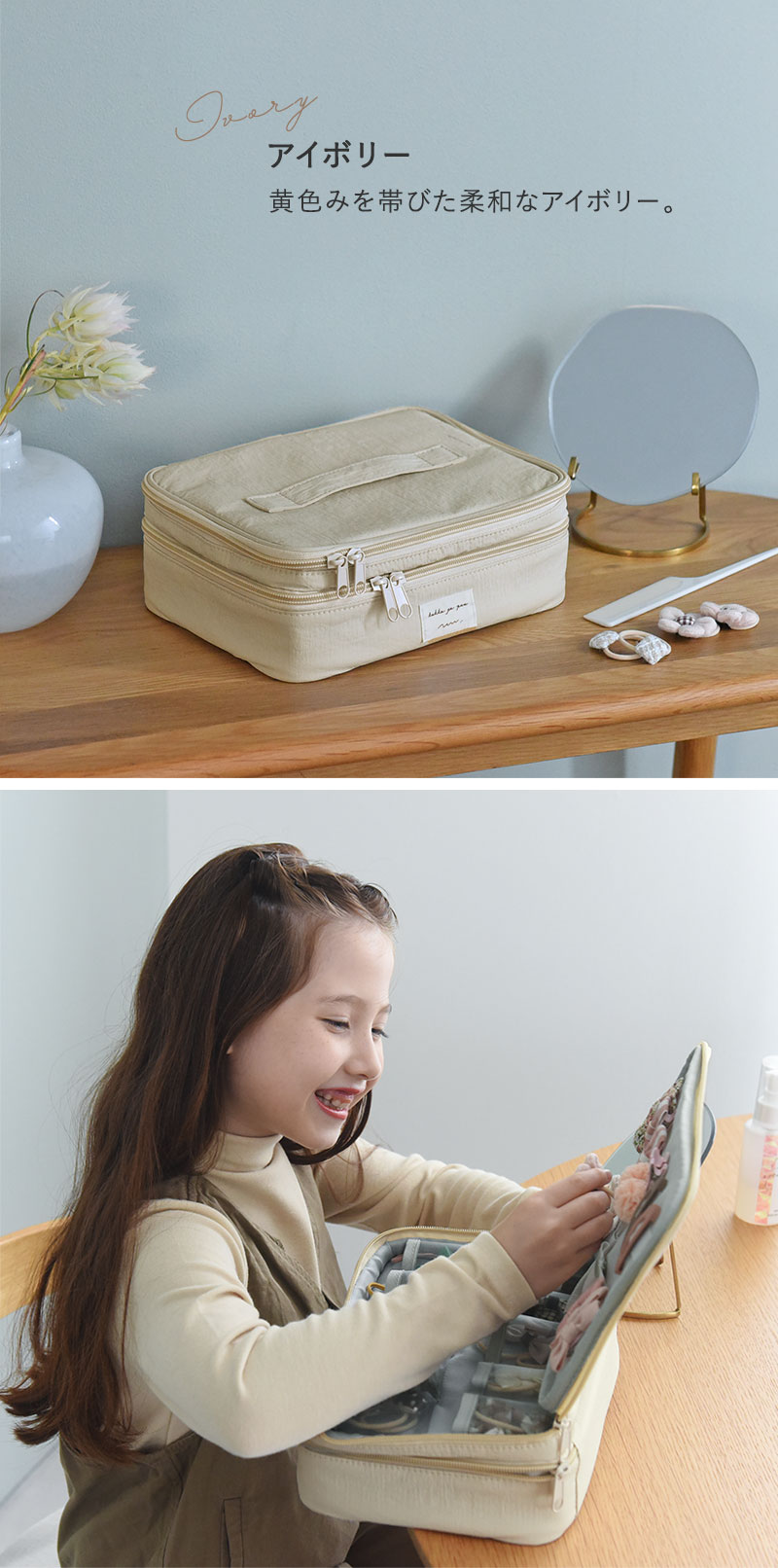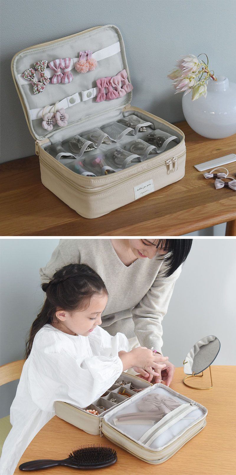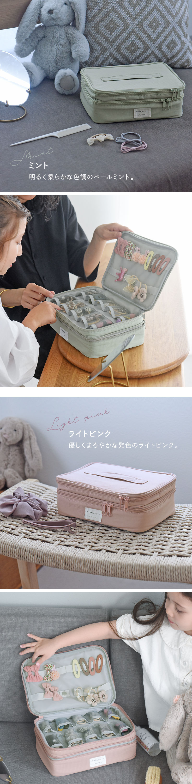 ヘアゴムにシュシュ、ヘアピンなど様々なアクセ類が収納しやすいように工夫した2段構造タイプ。何がしまってあるのかキッズたちも一目で分かりやすいよう、メッシュ素材を採用しています。