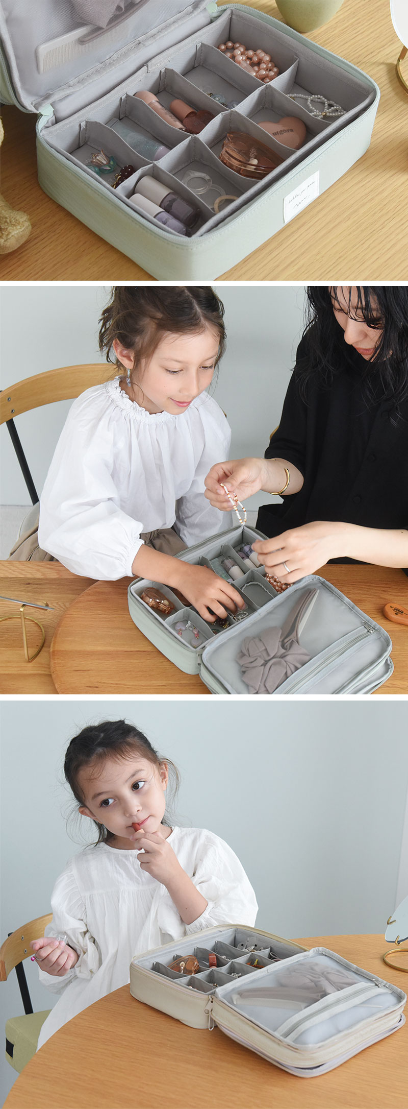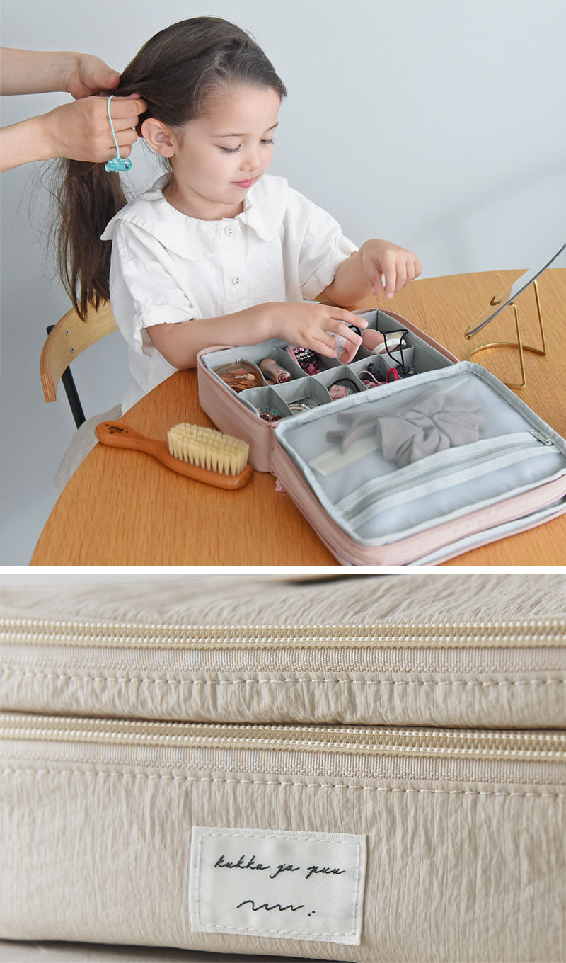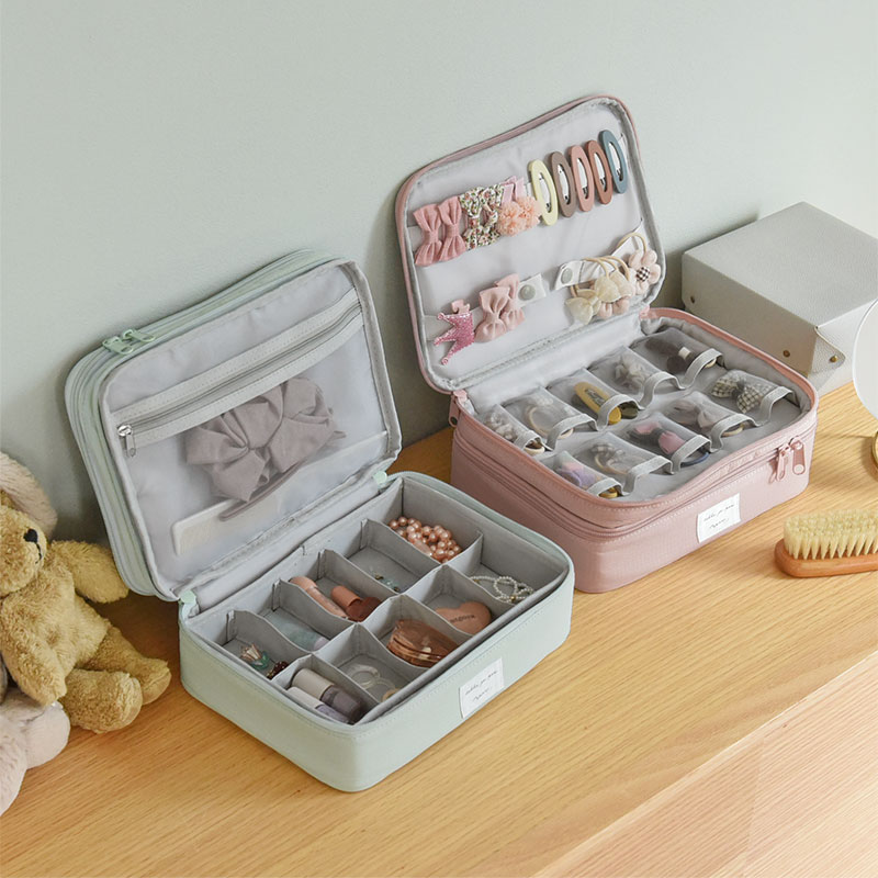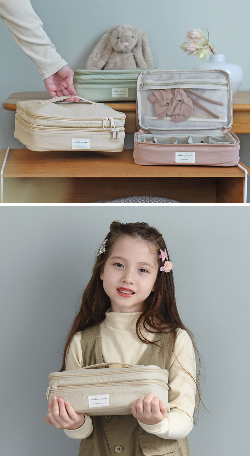 ヘアゴムにシュシュ、ヘアピンなど様々なアクセ類が収納しやすいように工夫した2段構造タイプ。何がしまってあるのかキッズたちも一目で分かりやすいよう、メッシュ素材を採用しています。