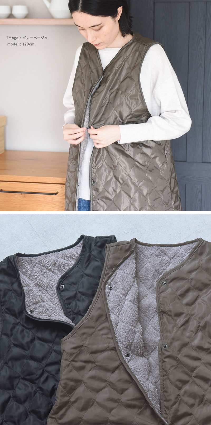 中綿入りのキルティング仕様で、裏側にはボアがついているので肌寒い季節にぴったり、ふんわり優しいぬくもりに包まれます。