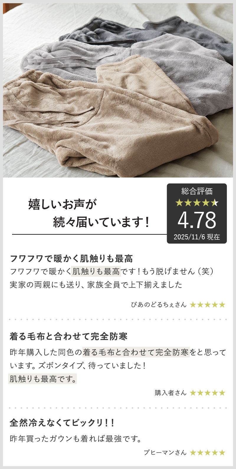部屋着として1枚さっと穿いてもOKですが、着る毛布と合わせれば、最強の寒さ対策に。スリーパーと合わせてお布団にぬくぬくくるまっても◎。