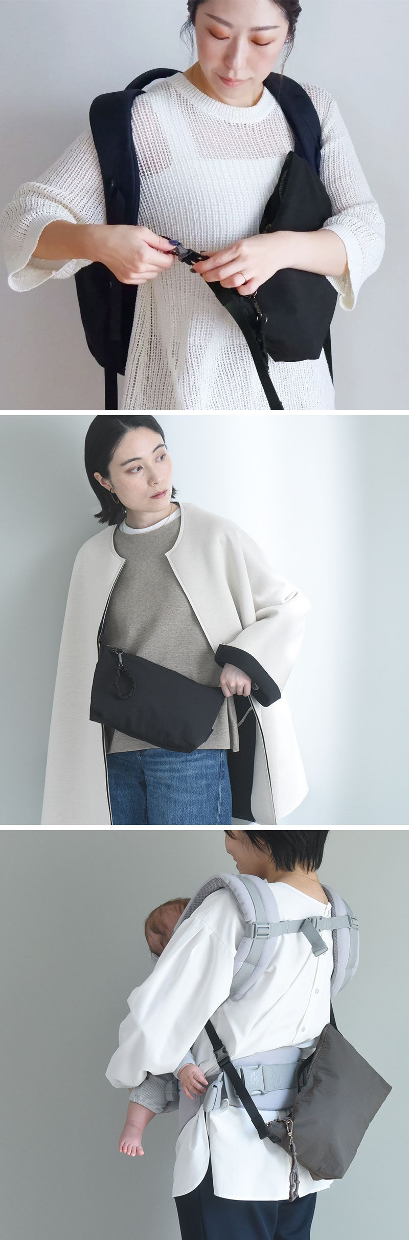 また、バックル付きのショルダーで分厚いアウターを着ていたり、ベビーを抱っこしている時でも取り外し簡単。小さな見た目に便利をぎゅっと詰め込んだ快適ショルダーです。