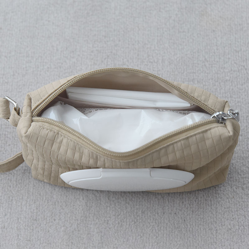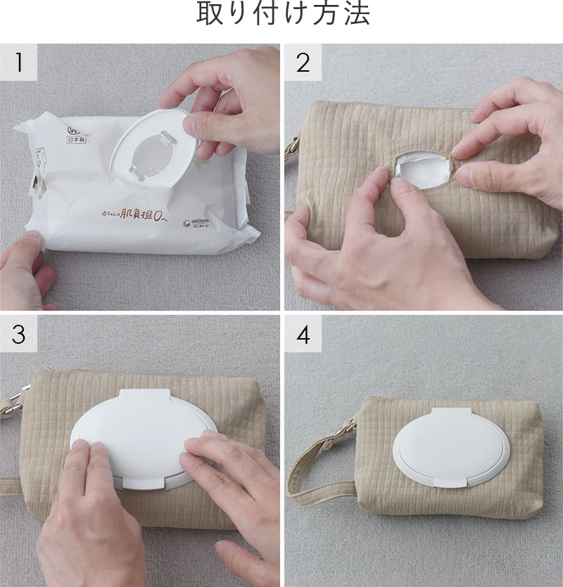 2、アタッチメントをつけたおしりふきをポーチに入れ、取り出し口から両端のつまみ部分が出るように調整します。