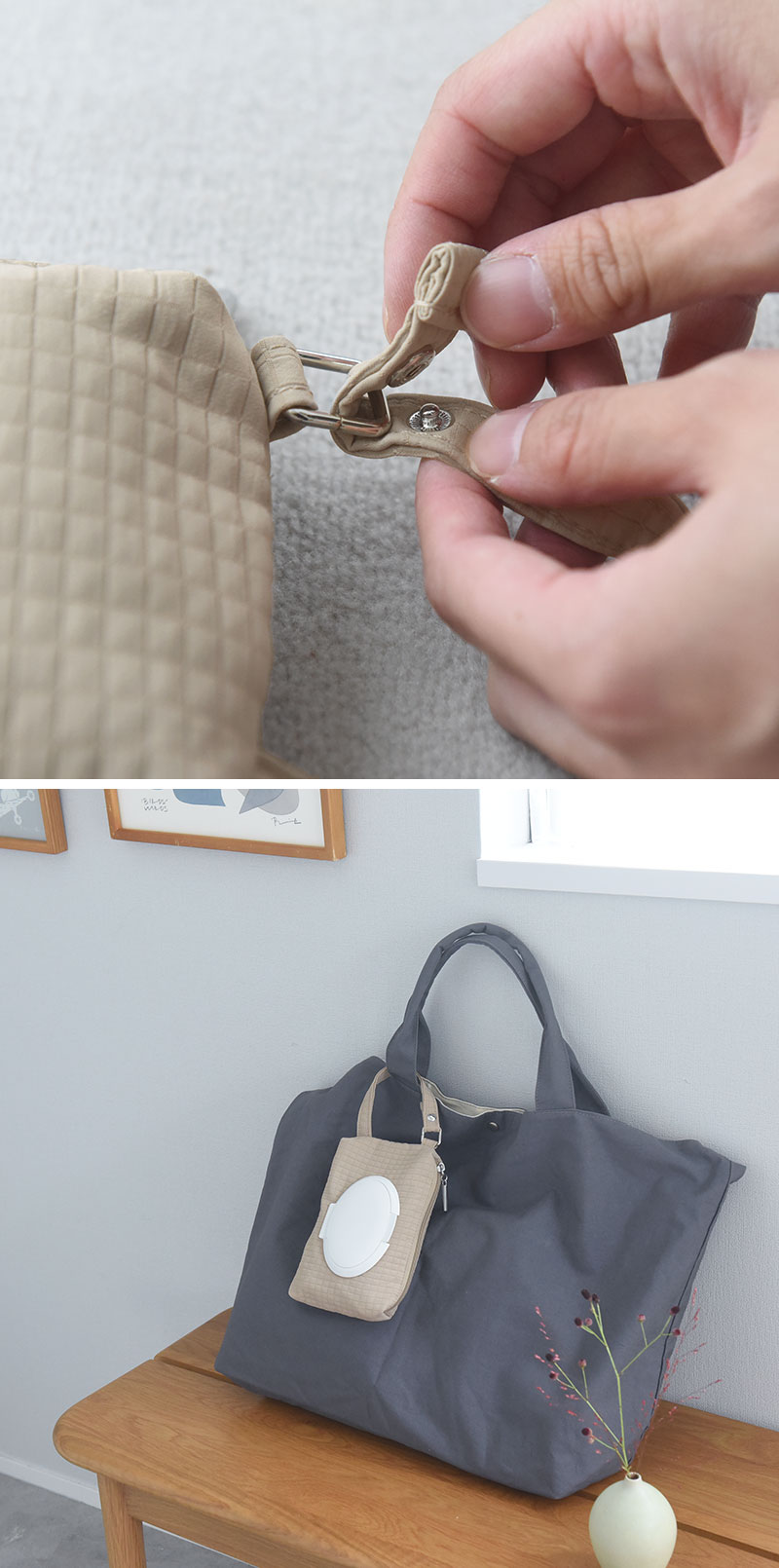 スナップボタン付きの持ち手をつけたことで、ベビーカーはもちろん、ママバッグやベビーチェアに引っ掛けて使うことも。腕にかけられるので、おむつ替えするときにサッと持ち歩けます。