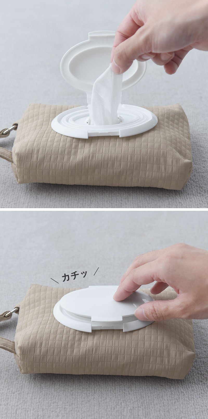 ※本体生地がフタに隠れるように、位置をご調整ください。おしりふきの水分がしみこみにくくなります。