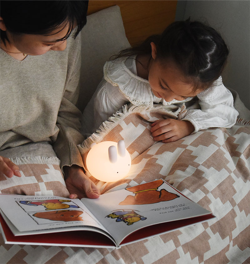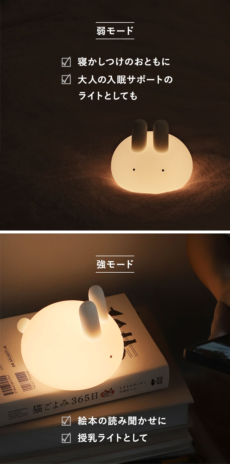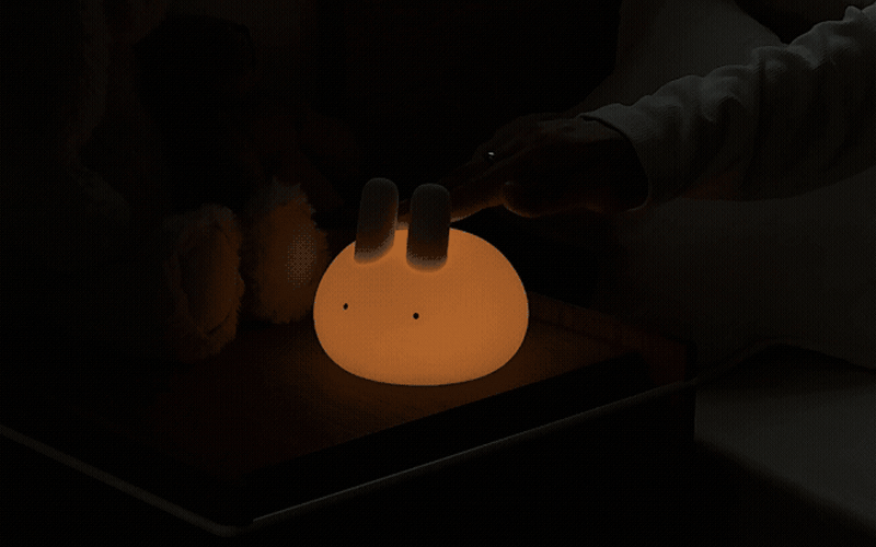 目の負担をやわらげ、入眠をやさしくサポートしてくれます。寝るときはタイマーにして就寝。夜中に目が覚めてもムギュッとさわれば点灯。ちょっと明かりが欲しい時にウサギが手助けしてくれます。
