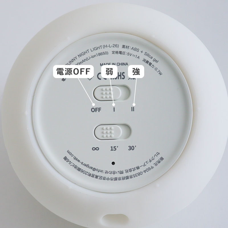約3時間の充電で、弱(LOW)なら約50時間、強(HIGH)なら約4.5時間点灯。帰省や旅行などのお泊りで眠る環境が変わっても、いつも一緒のうさぎライトがあれば安心してくれそうです。充電しながらのご使用もOKなので、日中に充電し忘れても◎。