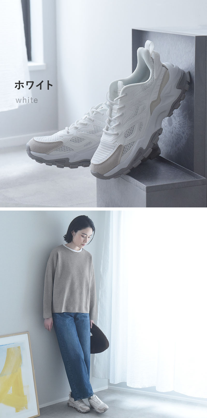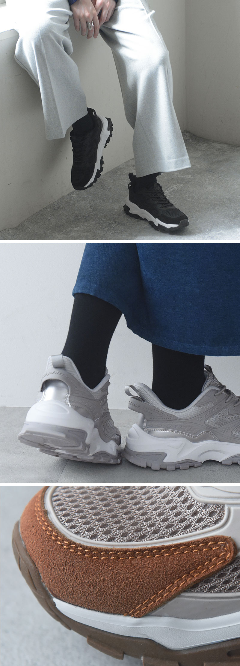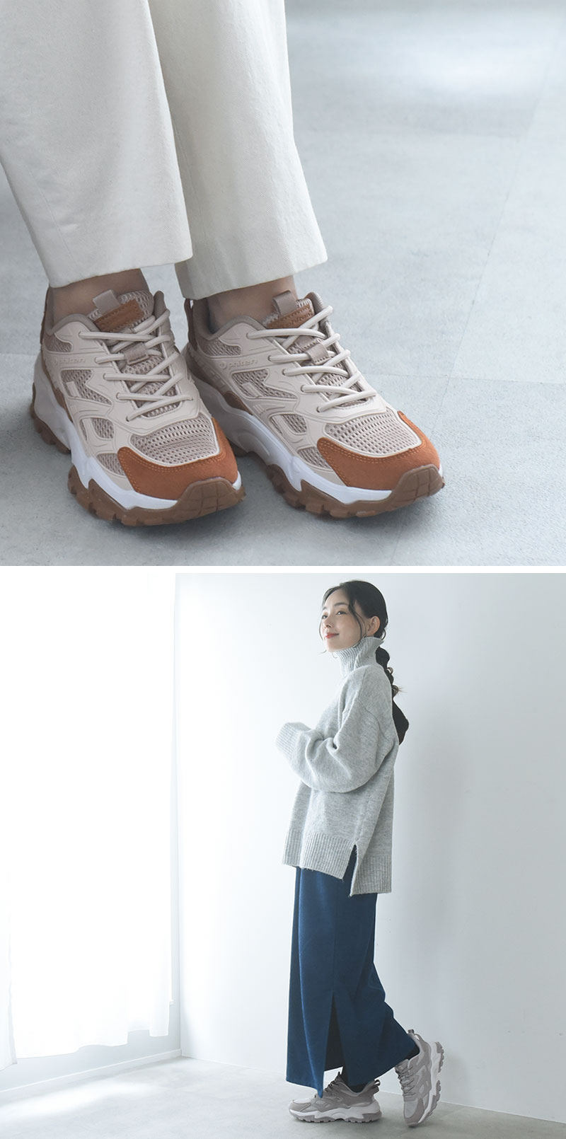 異素材を組み合わせたアッパーや、ボリュームのあるアウトソールで旬をまとったデザイン。トレンド感がありますが統一感のあるカラーリングで派手過ぎず、大人世代も取り入れやすい一足です。