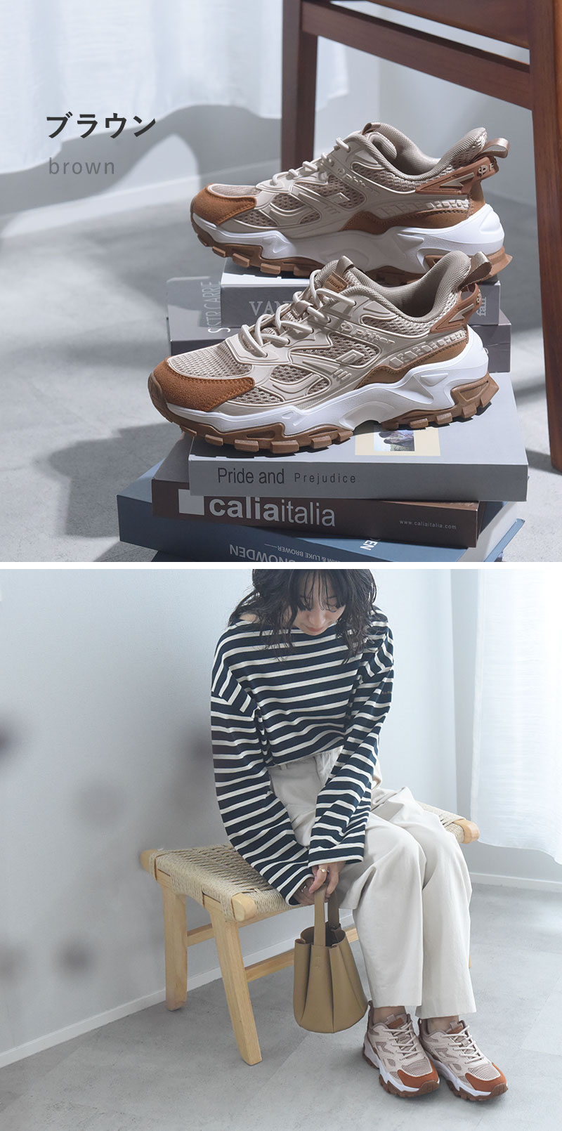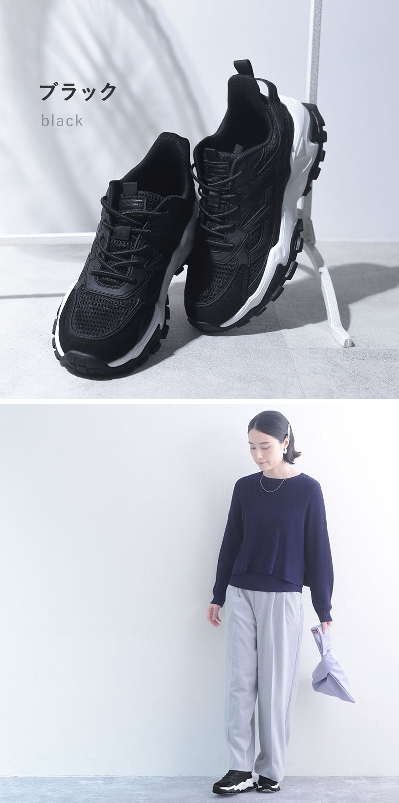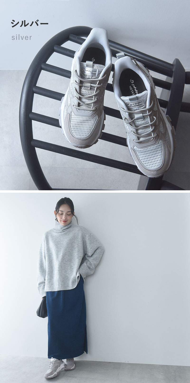 異素材を組み合わせたアッパーや、ボリュームのあるアウトソールで旬をまとったデザイン。トレンド感がありますが統一感のあるカラーリングで派手過ぎず、大人世代も取り入れやすい一足です。