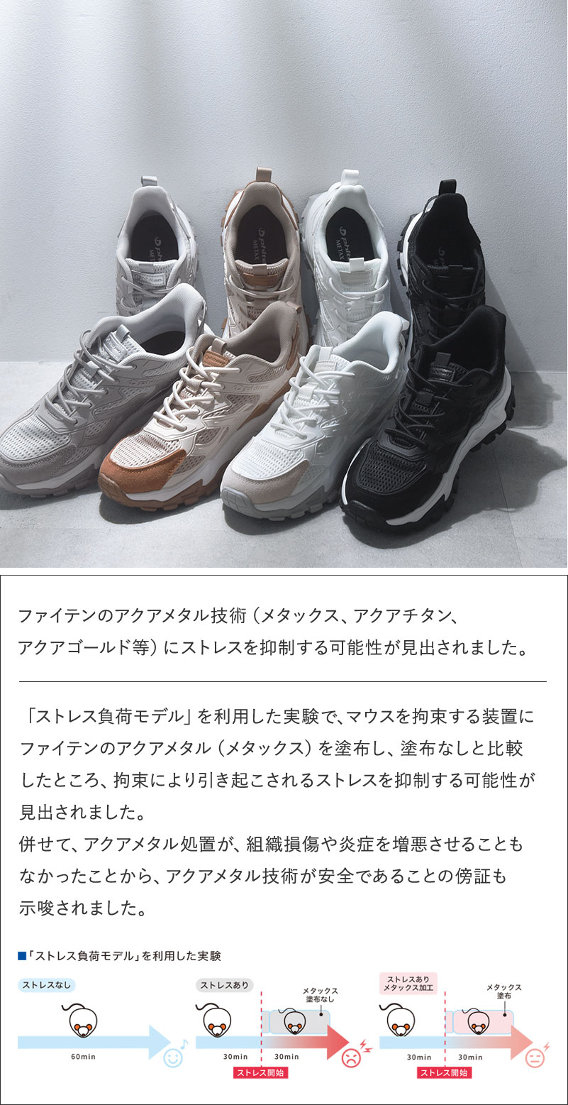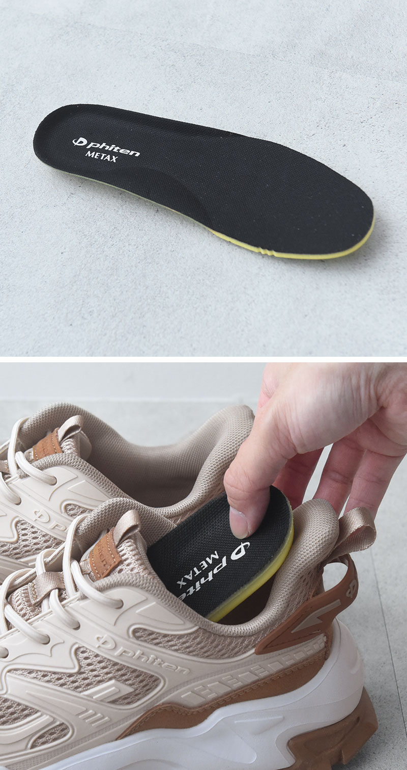 トップアスリートにも親しまれているファイテン社の技術を用いたスニーカー。インソールとアッパーに施してあるメタックス技術により、カラダをリラックス状態へとサポート。余計な負荷をかけず歩行を助けてくれます。