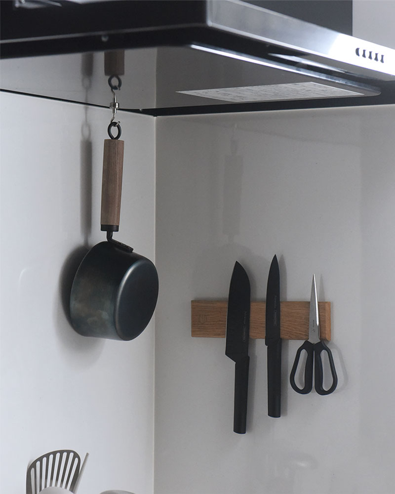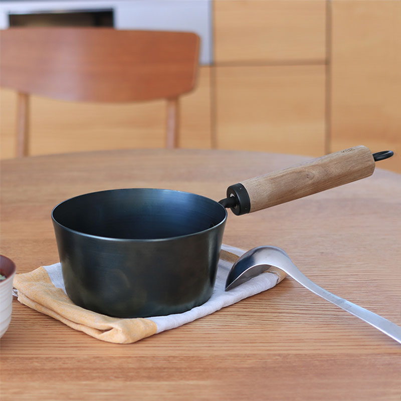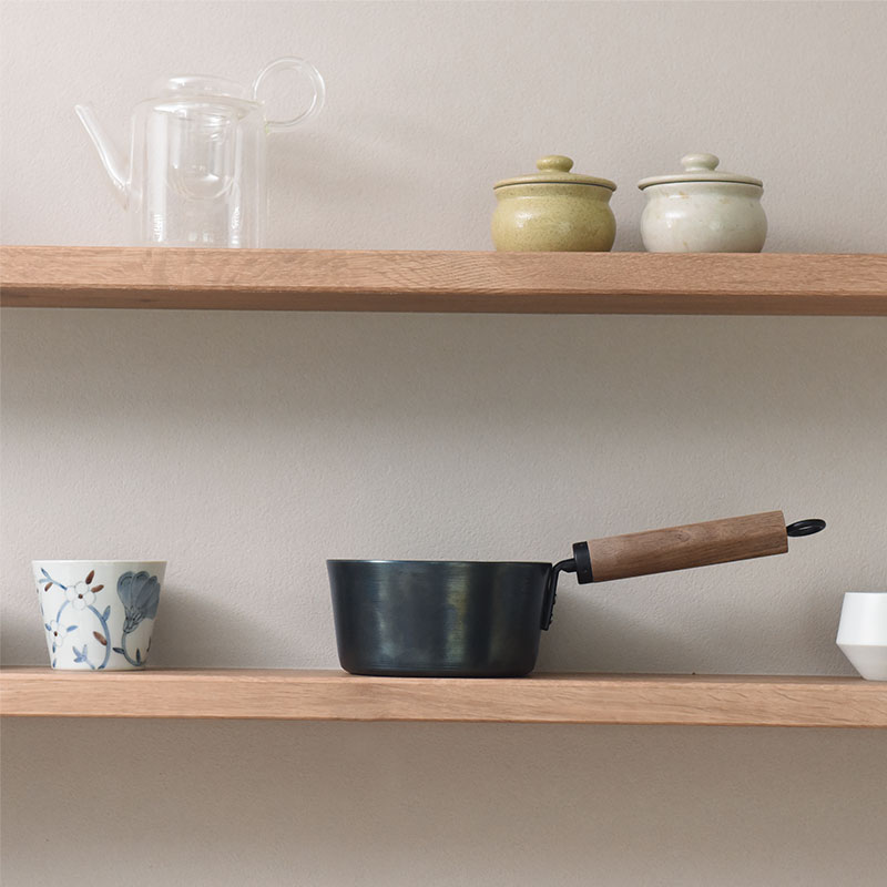 こちらはキッチンに出しっぱなしでも絵になるデザインに仕上げています。木の取手のやさしさと、洗練感ただようブラックの鉄が絶妙なバランス。