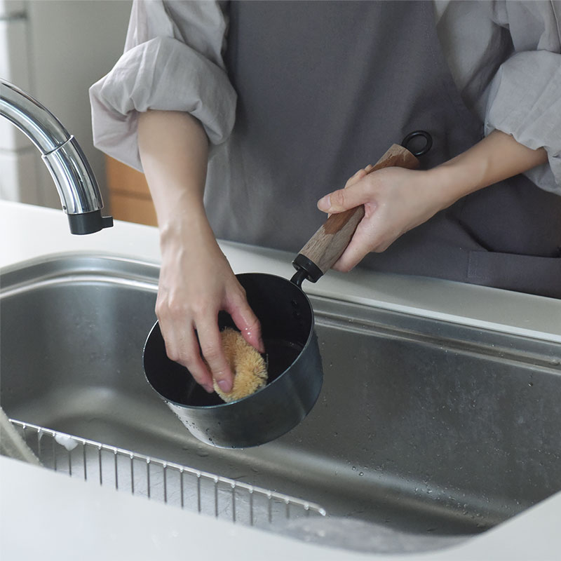 調理後フライパンが温かいうちに、たわしや竹のササラを使って、洗剤を使わずにお湯で洗ってください。