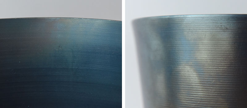 ※ハードテンパー加工の商品につきましては、手作業で焼き付けを行っておりますため「焼きムラ」「斑点」「油だまり」が生じる場合がございますが、品質に問題はございません。