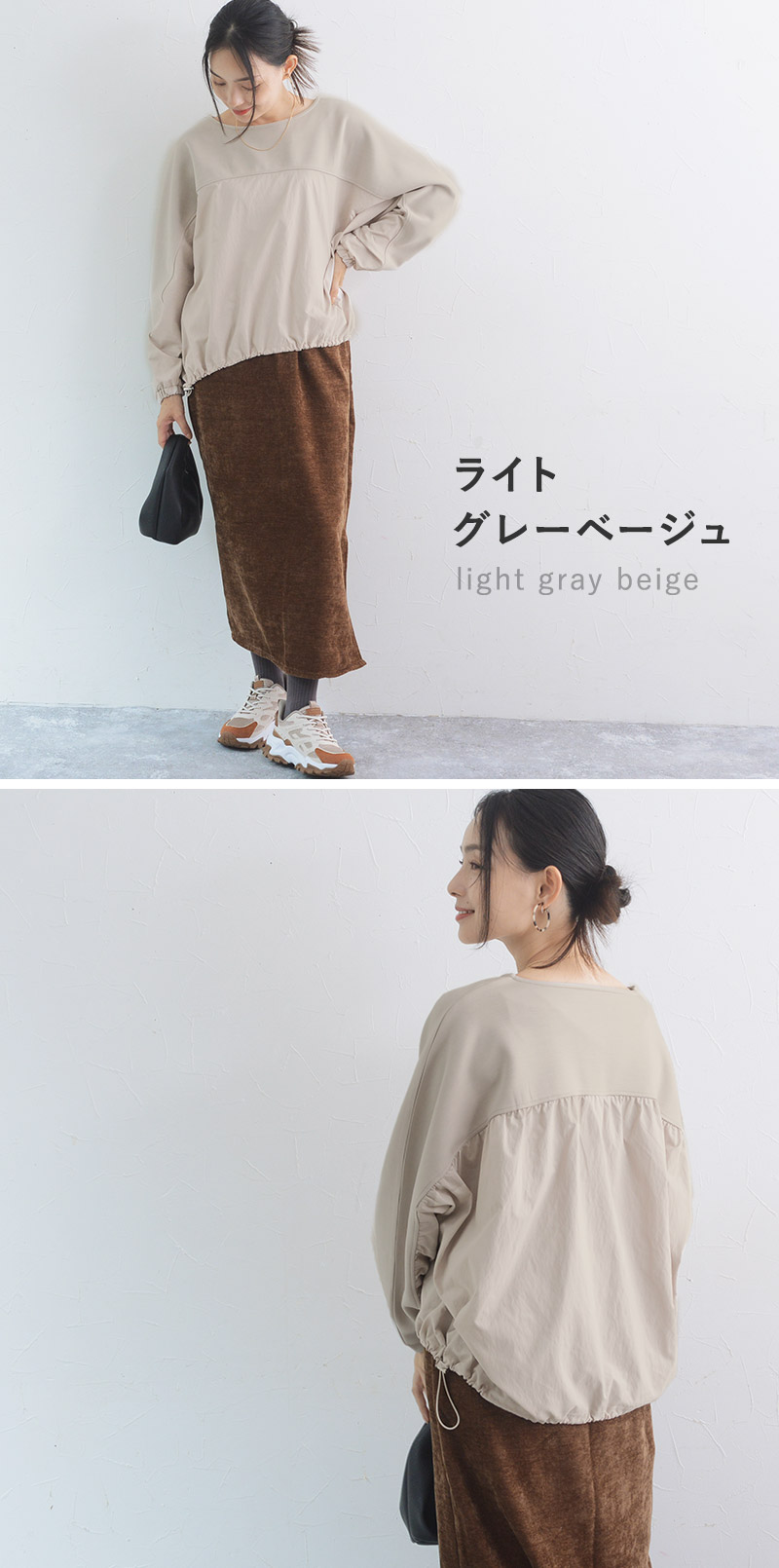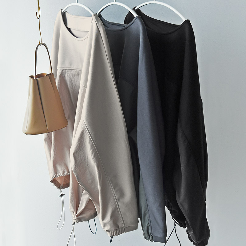 2つの素材を組み合わせることで、一般的なプルオーバーより軽やかな着心地に。遊びのある切り替えデザインですが、同色系でまとめることで着回ししやすい一着になりました。