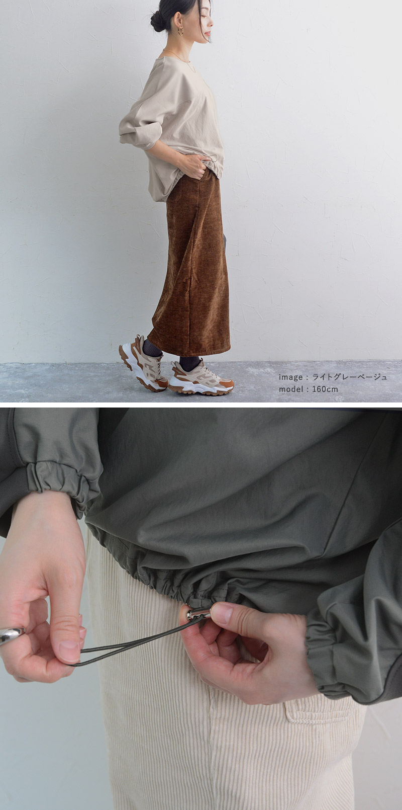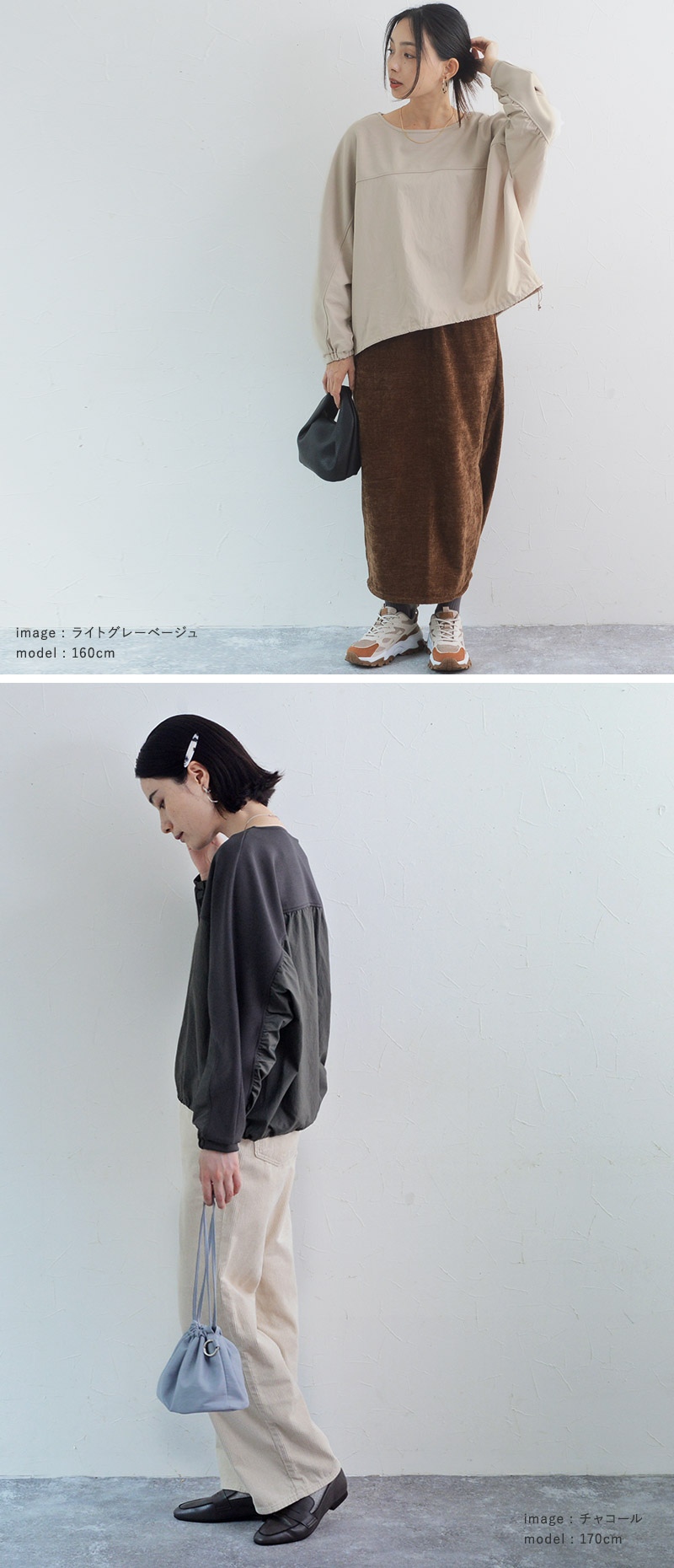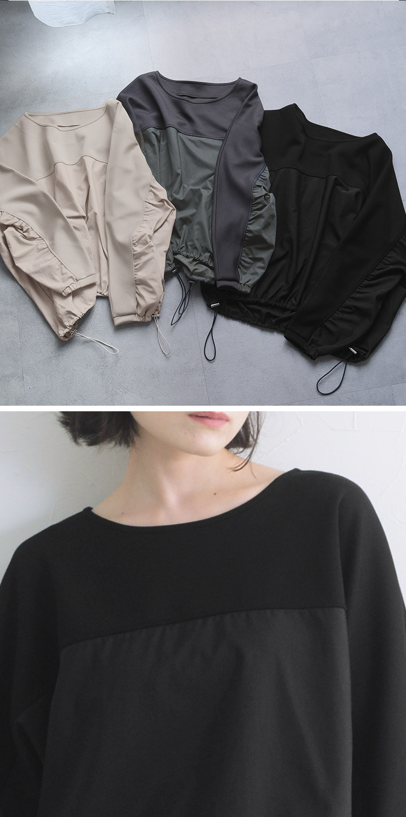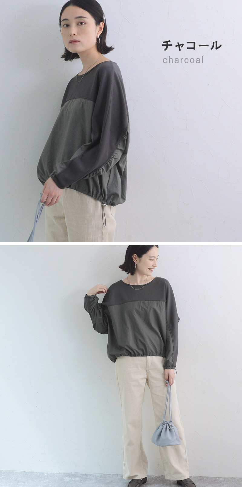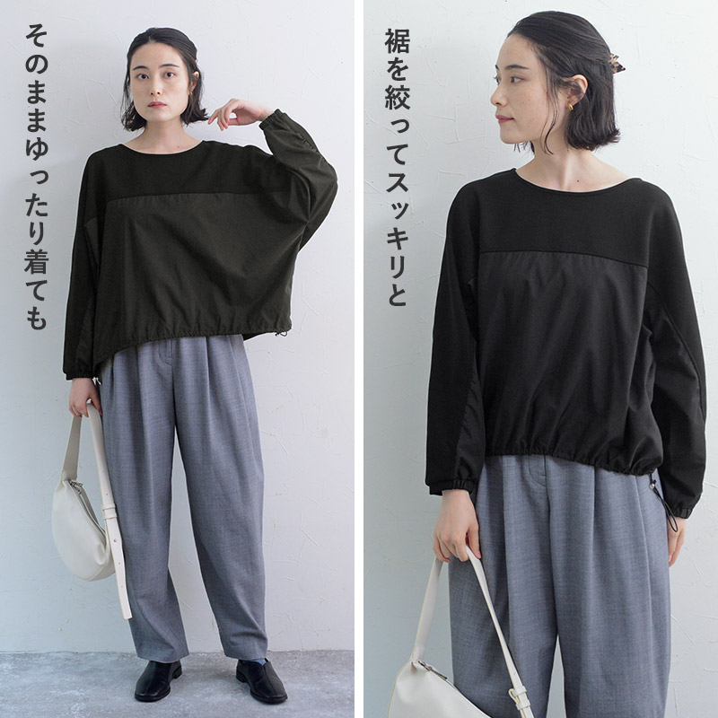 裾きゅっで印象チェンジができる、裾がドロスト仕様になったプルオーバー。裾を絞ることでバランス力がアップ、さらに異素材コンビの切り替えデザインで一枚映えも叶えます。