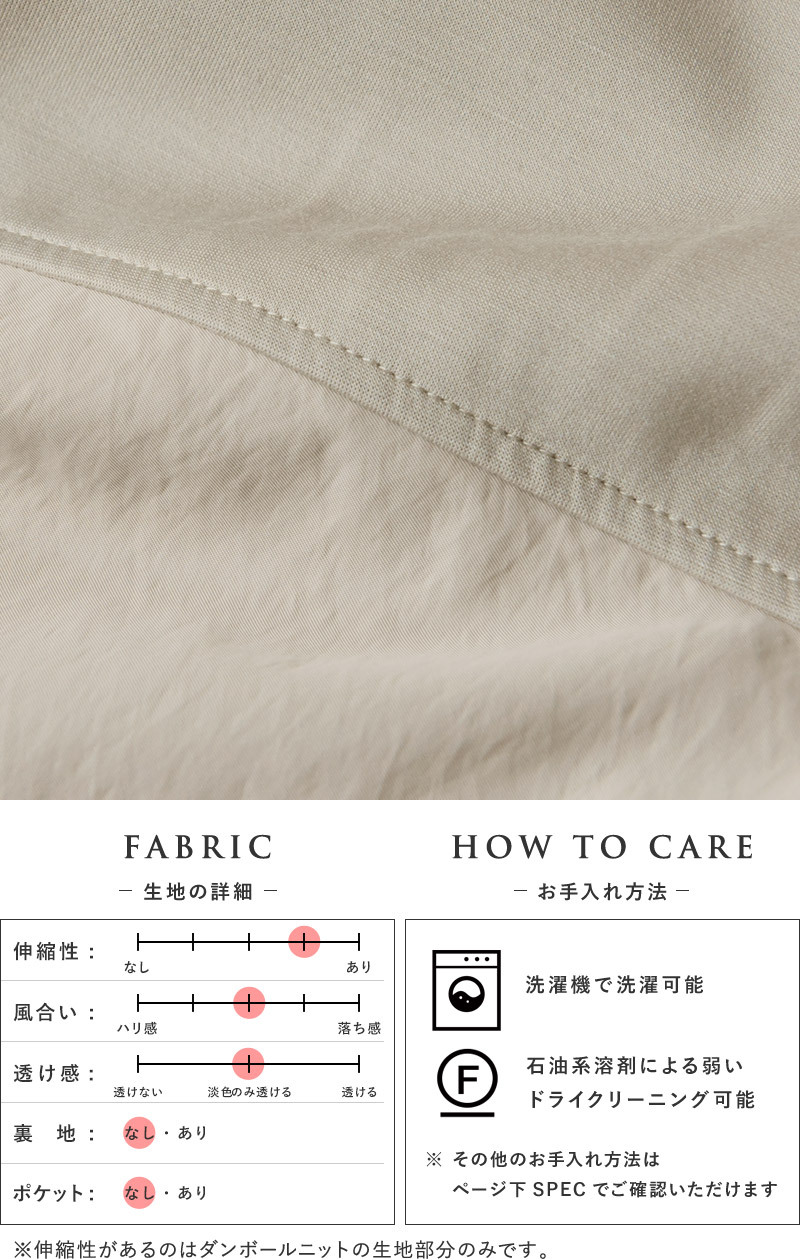 軽くて柔らかく、ストレッチ性があるダンボールニットとタフタのようなハリ感のある生地を組み合わせた、異素材コンビのトップス。