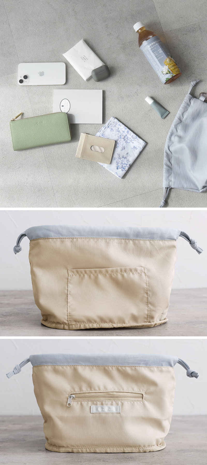 本体と同じ素材を使った巾着の紐は、細めにすることでポーチとしても使いやすくなっています。